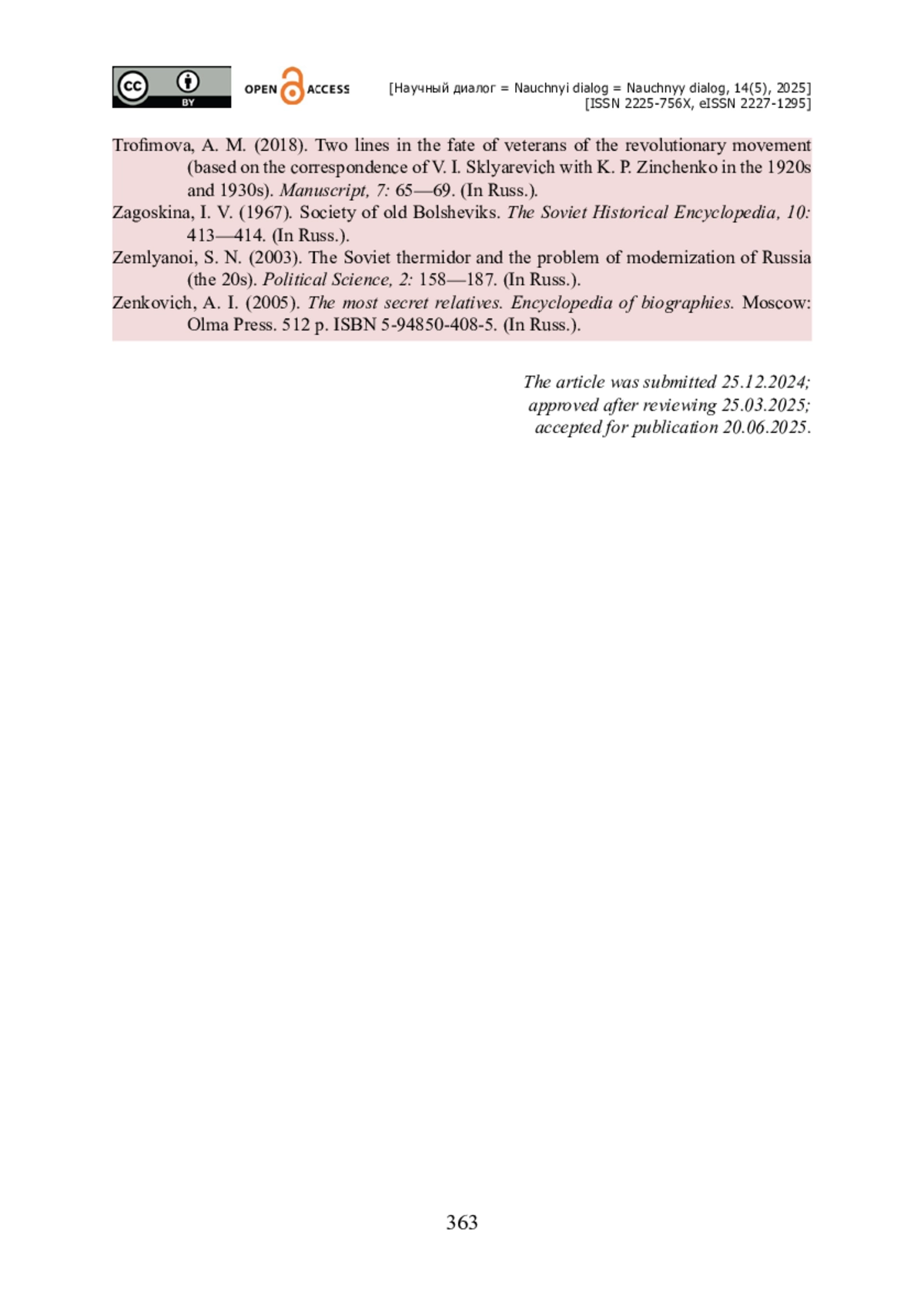 19. Трофимова А. М. Две линии в судьбах ветеранов революционного движения (по материалам переписки В. И. Скляревича с К. П. Зинченко 1920-1930-х гг.) / А. М. Трофимова // Манускрипт. - 2018. - № 7. - С. 65-69.
