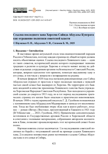 Исследуется история ссылки последнего хана Хорезма Сайида Абдуллы Кунграта в условиях политики советской власти по борьбе с титулованной элитой в первой половине 1920-х годов. Доказано, что в рассматриваемый период репрессии против хана и мужской части его семьи включали три этапа, проходили в нескольких регионах, предполагали разные виды наказаний, в том числе лишение свободы в концлагерях, и отразили процесс формирования советской государственной политики и правовых норм. В качестве источников привлечены документы Государственного архива Хорезмской области (Узбекистан) и Государственного архива Тюменской области в г. Тобольске (Россия). Методология исследования основана на многолинейной модели модернизации П. Штомпка. Использованы сравнительно-исторический и сравнительно-правовой методы исследования. Авторы приходят к выводу, что в Хорезме в начале 1920-х годов политика советской власти и действие революционного права в отношении Сайида Абдуллы Кунграта и его семьи находились под влиянием мусульманско-традиционных представлений, а применение этих норм в России зависело от комплекса факторов, включая мировоззрение и личностные качества кадрового состава служащих. Установлено, что исполнение решения о высылке Хивинского хана, принятое Хорезмской Чрезвычайной комиссией, носило хаотичный и непоследовательный характер: репрессивные меры менялись в соответствии с этапами реформирования органов госбезопасности Советской России.
