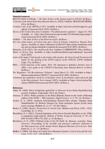 1. Алимова Ю. Государственные должности в Хивинском ханстве (на основе про изведений русских авторов XVIII - XIX вв.) / Ю. Алимова, М. Сардарова // Цифровая наука. - 2021. - № 4-2. - С. 59-63.
