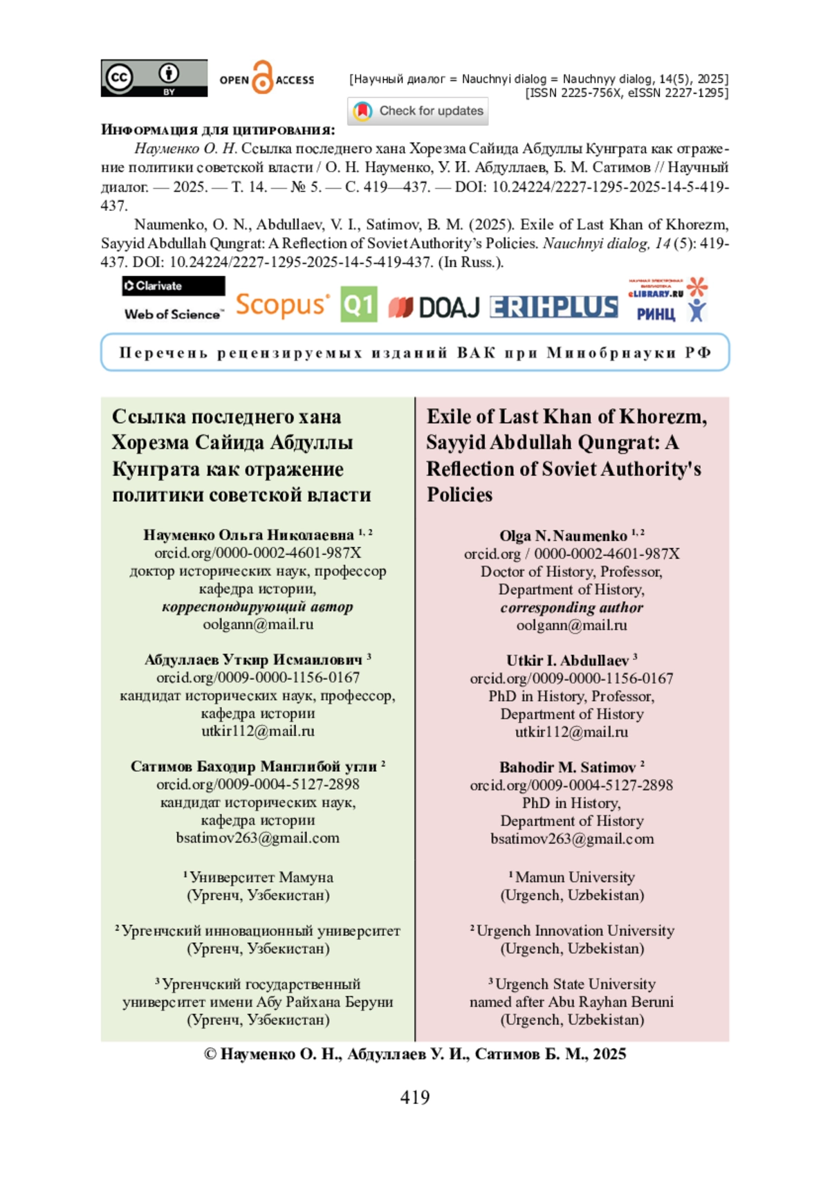 12. Науменко О. Н. Адаптация шариата к российскому уголовному праву у населения Западного Туркестана и сибирских бухарцев в конце XVIII - начале ХХ веков / О. Н. Науменко, У. И. Абдуллаев // Научный диалог. - 2024. - Т. 13. - № 5. - С. 437- 455. - https://doi.org/10.24224/2227-1295-2024-13-5-437-455.