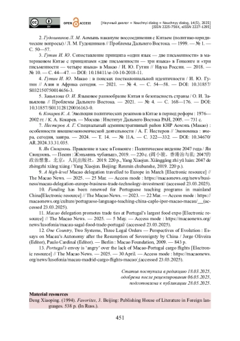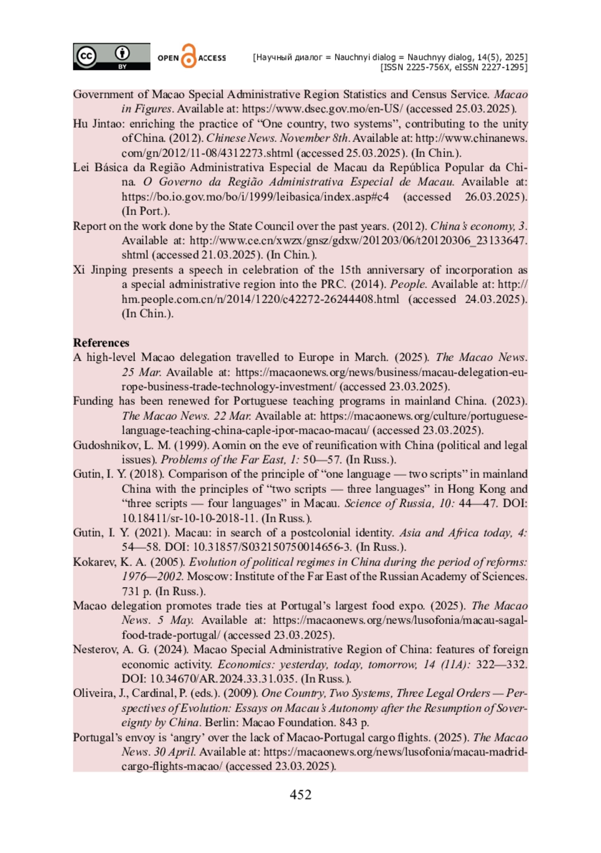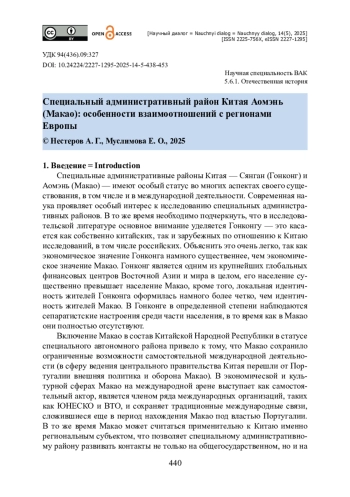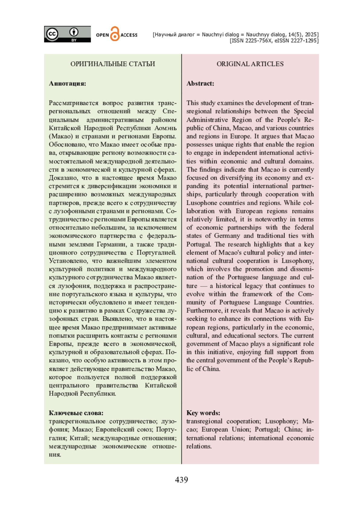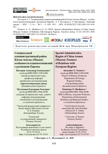 НЕСТЕРОВ А. Г., МУСЛИМОВА Е. О. СПЕЦИАЛЬНЫЙ АДМИНИСТРАТИВНЫЙ РАЙОН КИТАЯ АОМЭНЬ (МАКАО): ОСОБЕННОСТИ ВЗАИМООТНОШЕНИЙ С РЕГИОНАМИ ЕВРОПЫ // НАУЧНЫЙ ДИАЛОГ. 2025. ТОМ 14, № 5