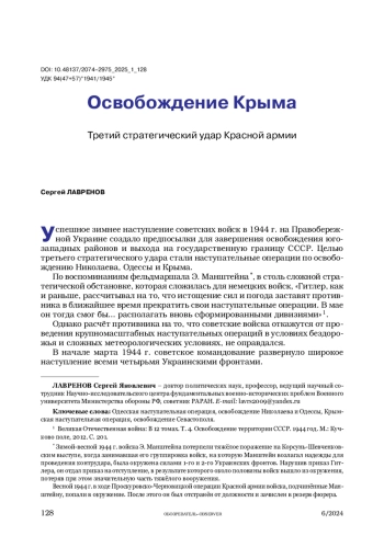 На основании исторических документов автор рассматривает особенности планирования Крымской наступательной операции (8 апреля – 12 мая 1944 г.), анализирует основные трудности при её подготовке и проведении, раскрывает военно-политическое и стратегическое значение освобождения Крыма Красной армией.