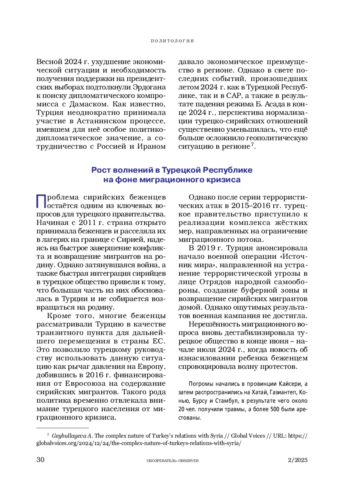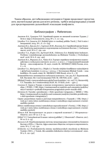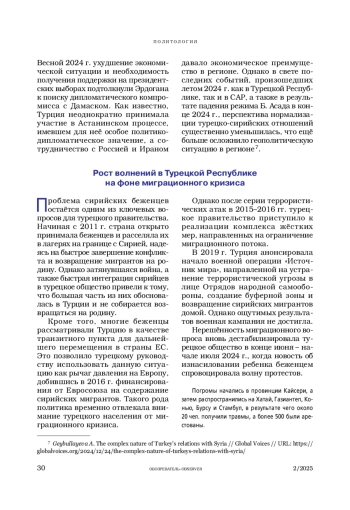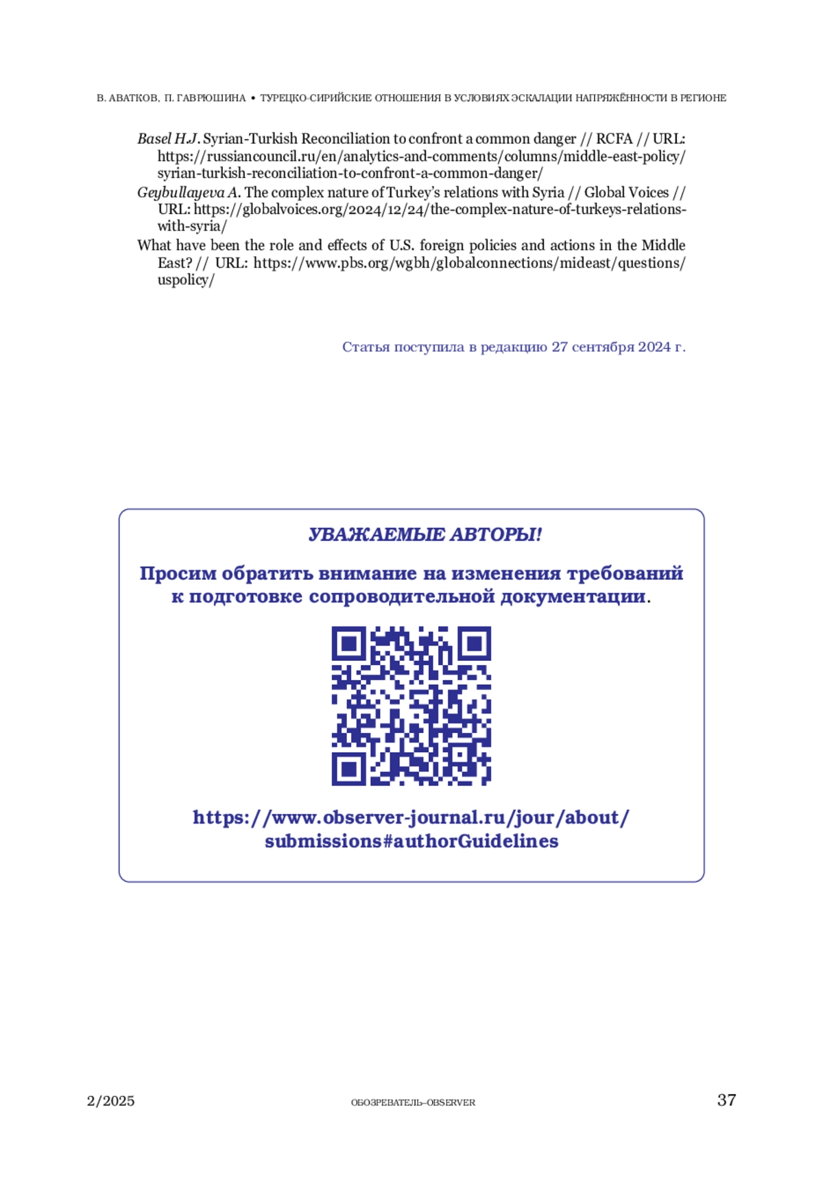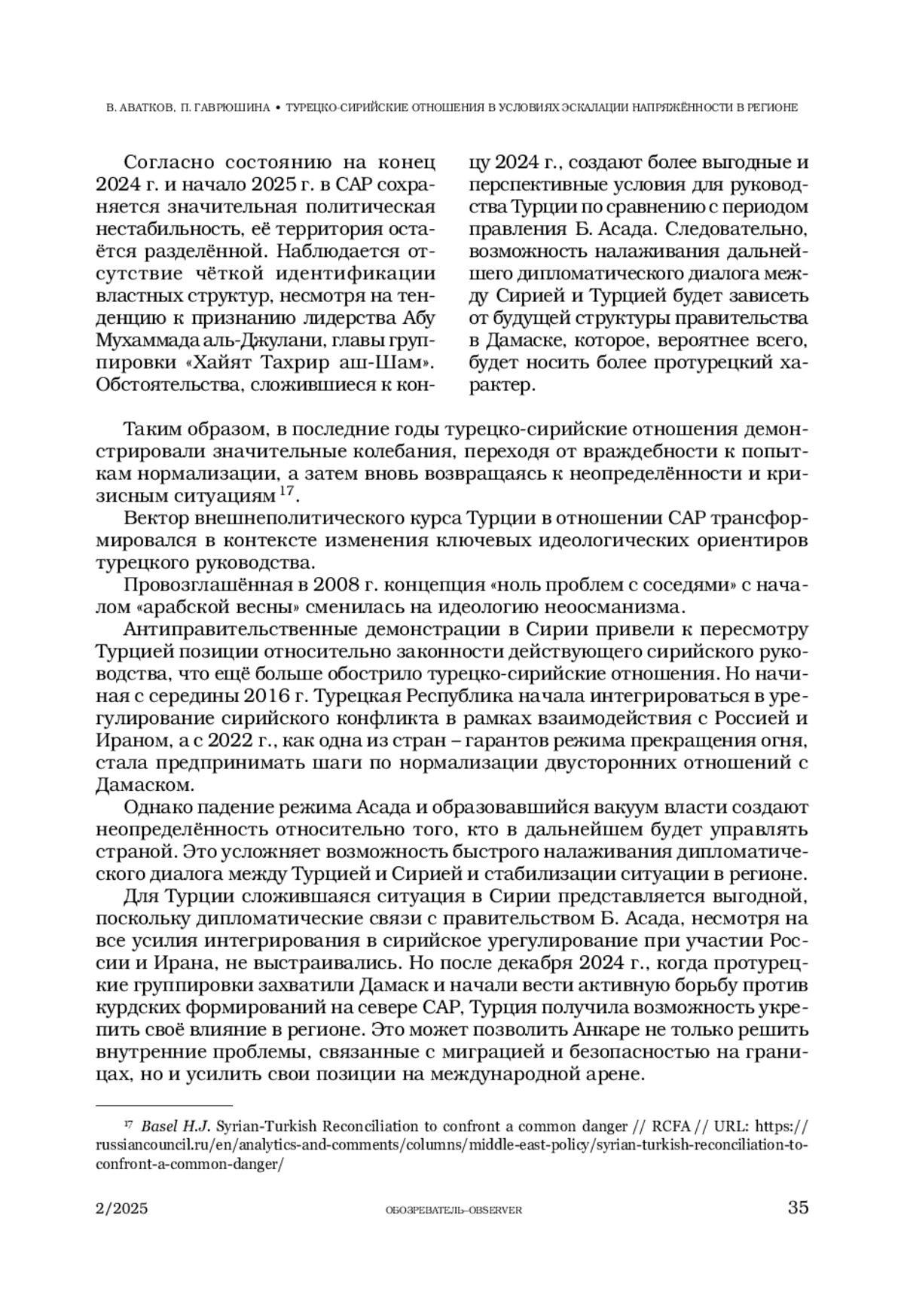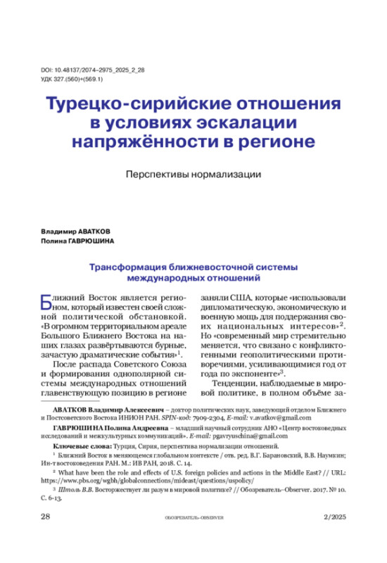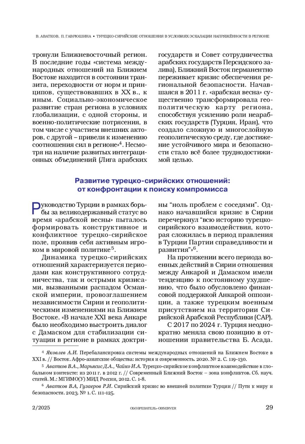 АВАТКОВ В. А., ГАВРЮШИНА П. А. ТУРЕЦКО-СИРИЙСКИЕ ОТНОШЕНИЯ В УСЛОВИЯХ ЭСКАЛАЦИИ НАПРЯЖЁННОСТИ В РЕГИОНЕ. ПЕРСПЕКТИВЫ НОРМАЛИЗАЦИИ // ОБОЗРЕВАТЕЛЬ. 2025. № 2