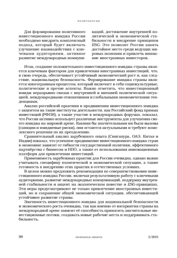 Автор рассматривает теоретические основы формирования инвестиционного имиджа страны на основе анализа российской практики, показывает ключевые аспекты и инструменты продвижения России как привлекательного направления для иностранных инвестиций, включая роль государственной политики, международных форумов и стратегий цифрового продвижения; анализирует успешные примеры из других стран (Сингапура, ОАЭ, США и Китая). В статье даются рекомендации по улучшению инвестиционного имиджа России.
