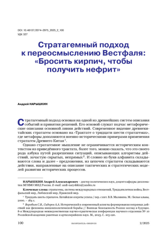 17. Штоль В.В., Задохин А.Г. Соперничество великих держав в контексте цивилизационного развития // Обозреватель-Observer. 2019. № 1. С. 5-20.