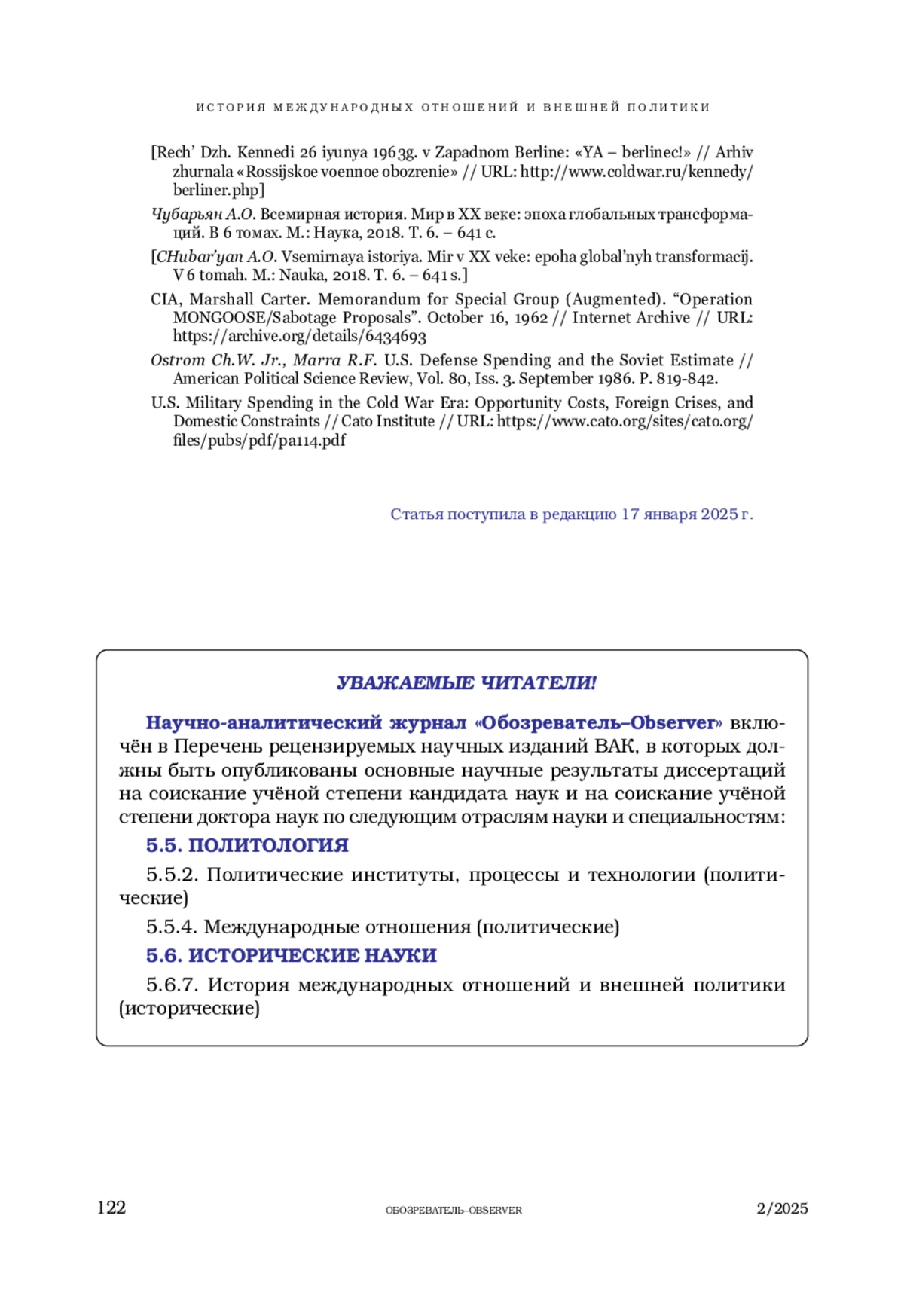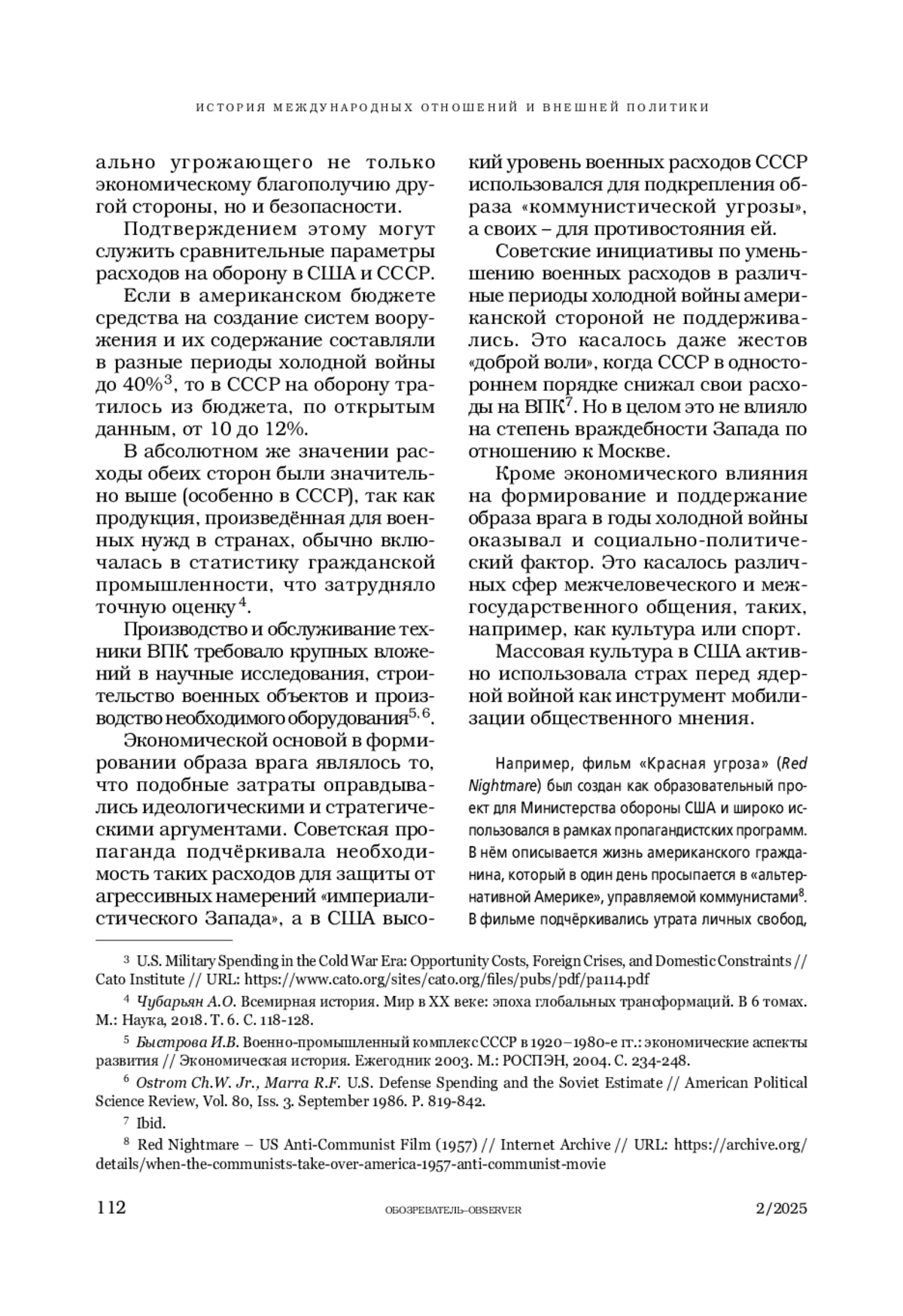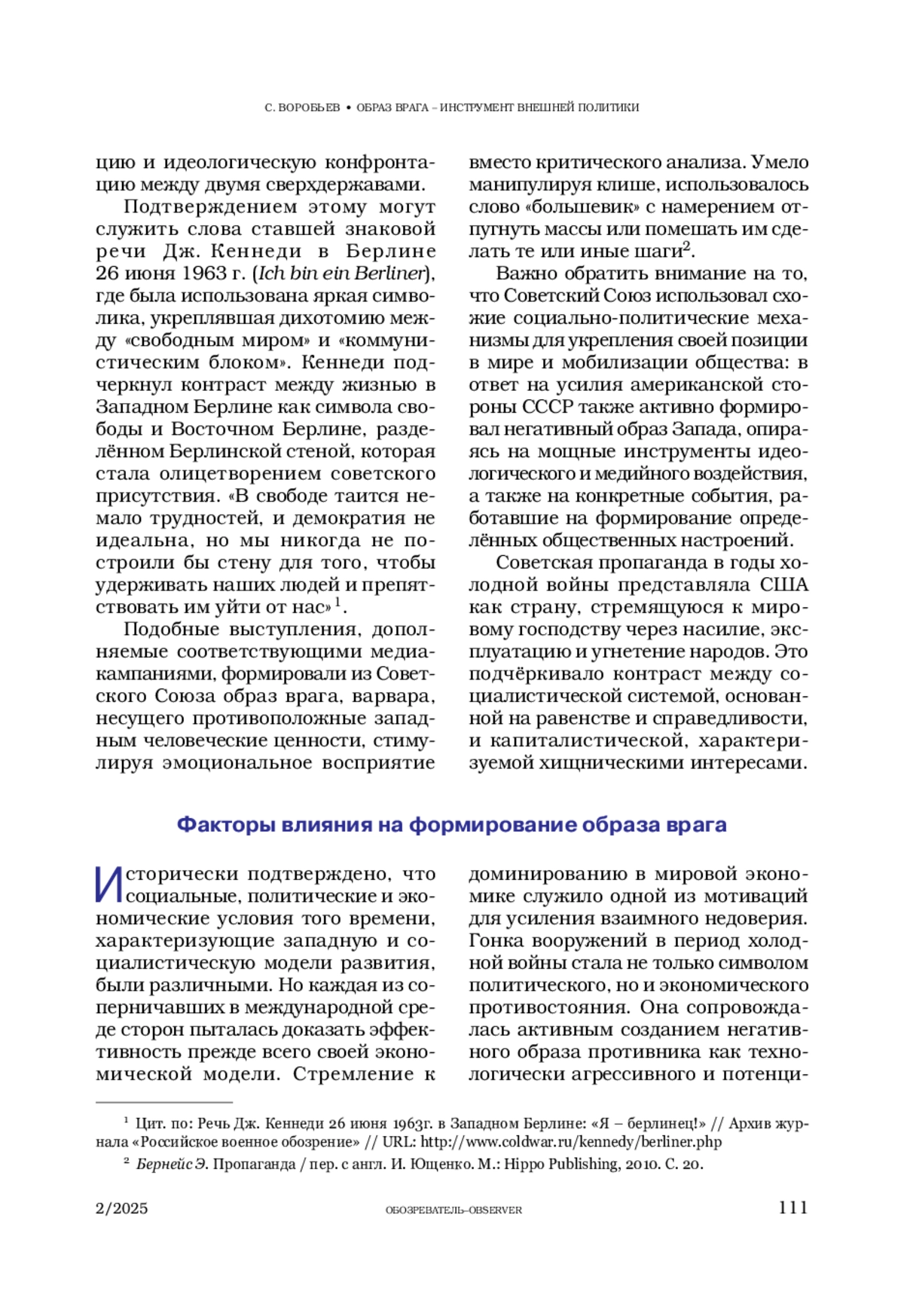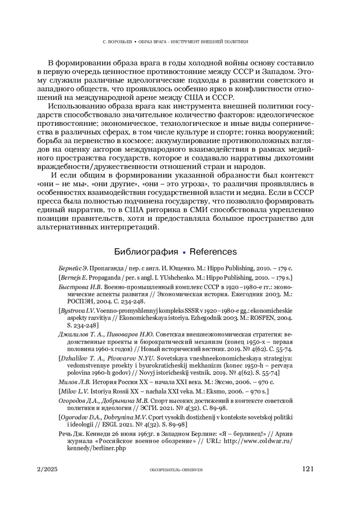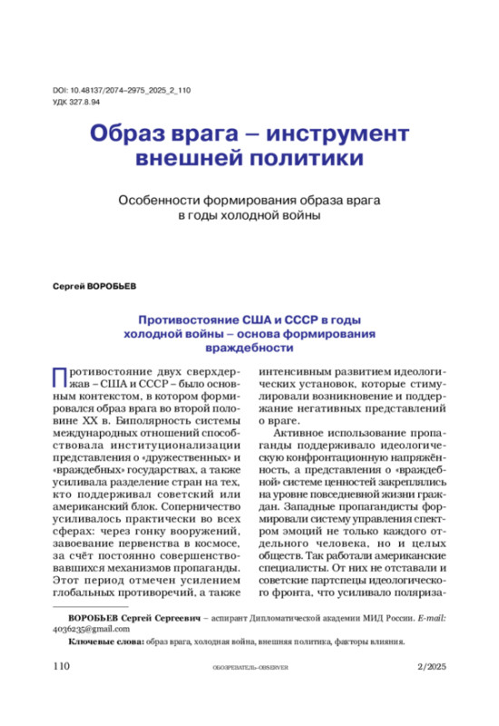 ВОРОБЬЕВ С. С. ОБРАЗ ВРАГА – ИНСТРУМЕНТ ВНЕШНЕЙ ПОЛИТИКИ. ОСОБЕННОСТИ ФОРМИРОВАНИЯ ОБРАЗА ВРАГА В ГОДЫ ХОЛОДНОЙ ВОЙНЫ // ОБОЗРЕВАТЕЛЬ. 2025. № 2