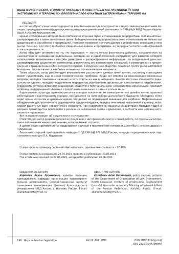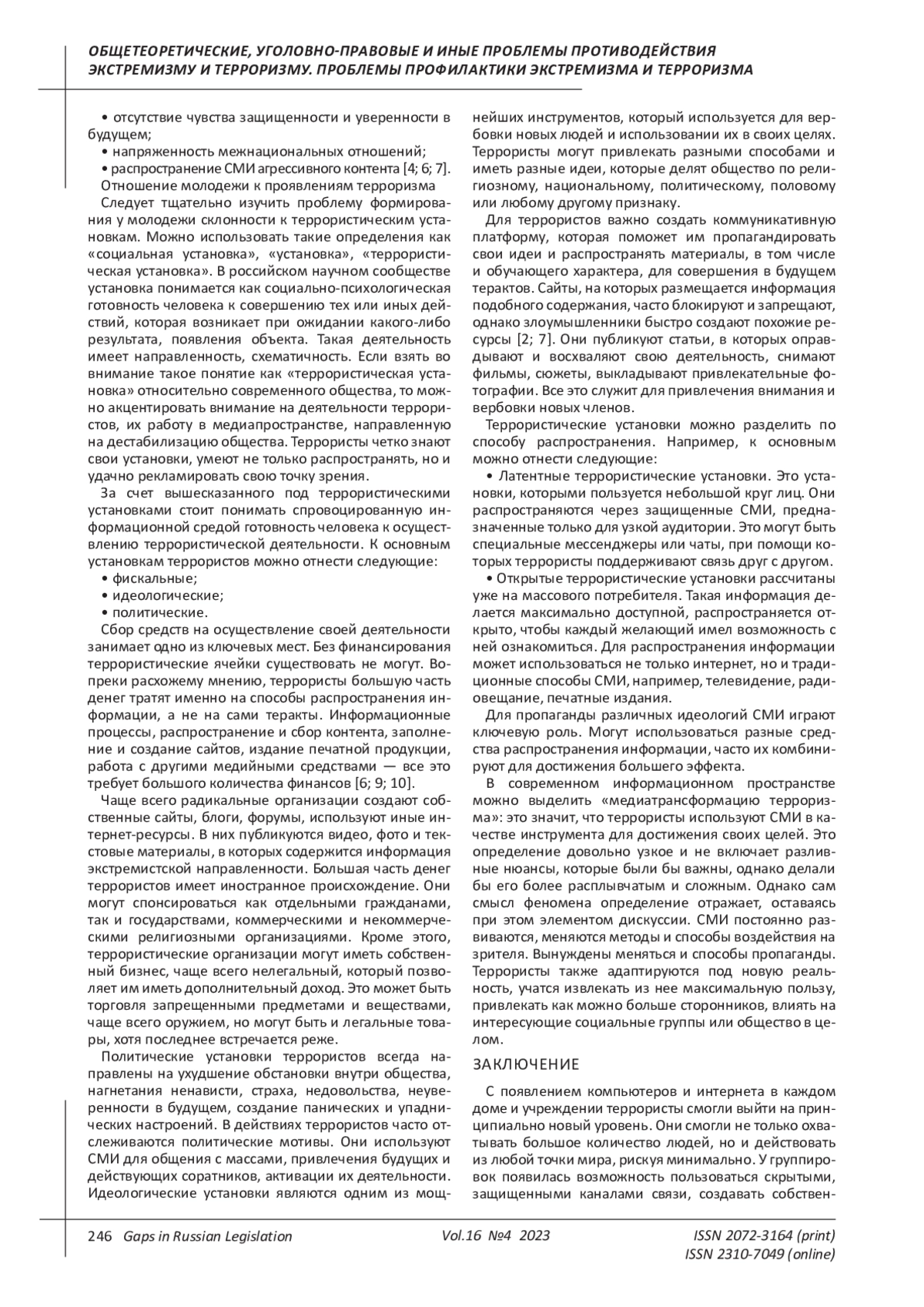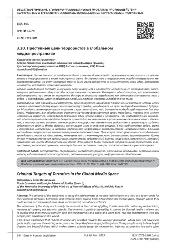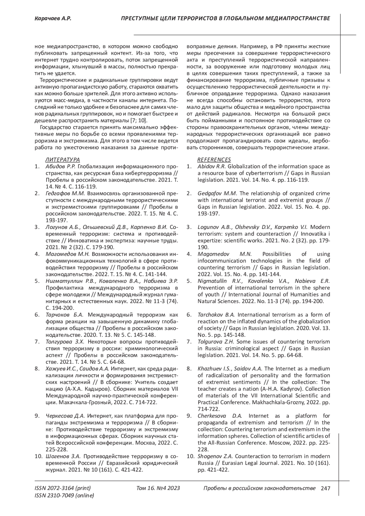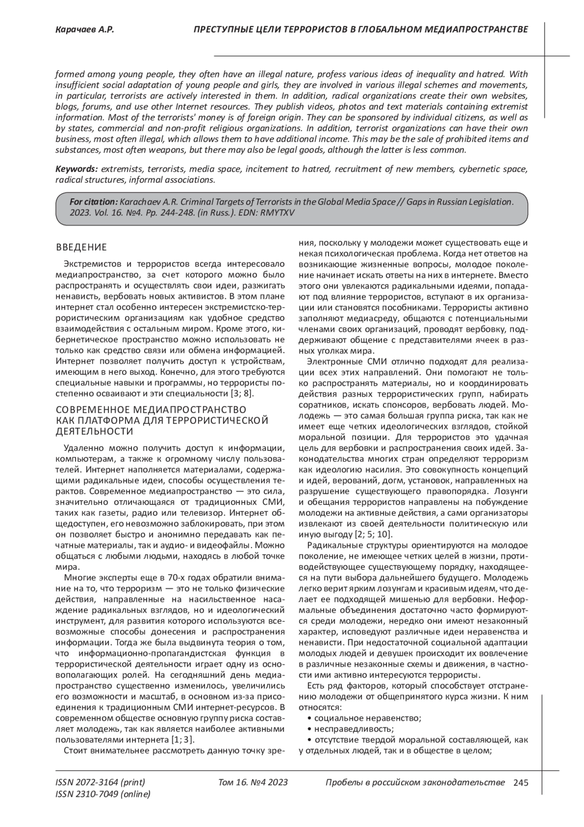 КАРАЧАЕВ А. Р. ПРЕСТУПНЫЕ ЦЕЛИ ТЕРРОРИСТОВ В ГЛОБАЛЬНОМ МЕДИАПРОСТРАНСТВЕ // ПРОБЕЛЫ В РОССИЙСКОМ ЗАКОНОДАТЕЛЬСТВЕ. 2023. Т. 16 № 4