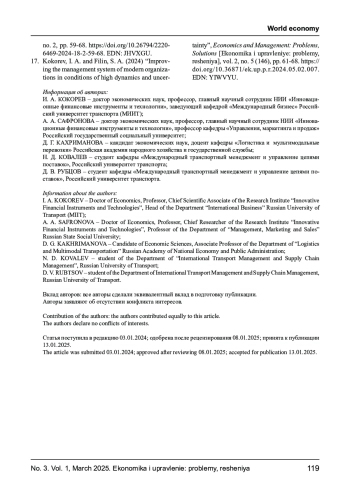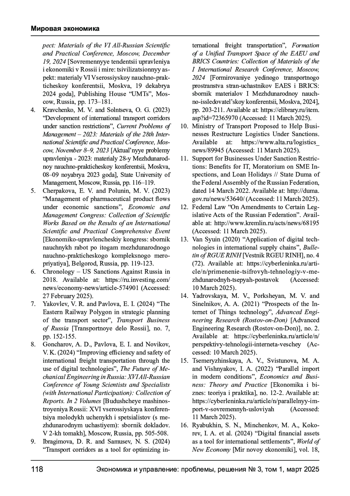 4. Кравченко М. В., Солнцева О. Г. Развитие международных транспортных коридоров в условиях санкционных ограничений // Актуальные проблемы управления - 2023: материалы 28-й Международной научно-практической конференции, Москва, 08-09 ноября 2023 года. - Москва: Государственный университет управления, 2023. - С. 116-119. EDN: OCTPON