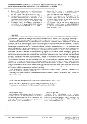 2. Ермолович Я.Н. Анализ статистических показателей судимости военнослужащих Российской Федерации за преступления против военной службы в 2021 г. // Военное право. 2023. № 1 (77). С. 158-164. EDN: FEQZAX