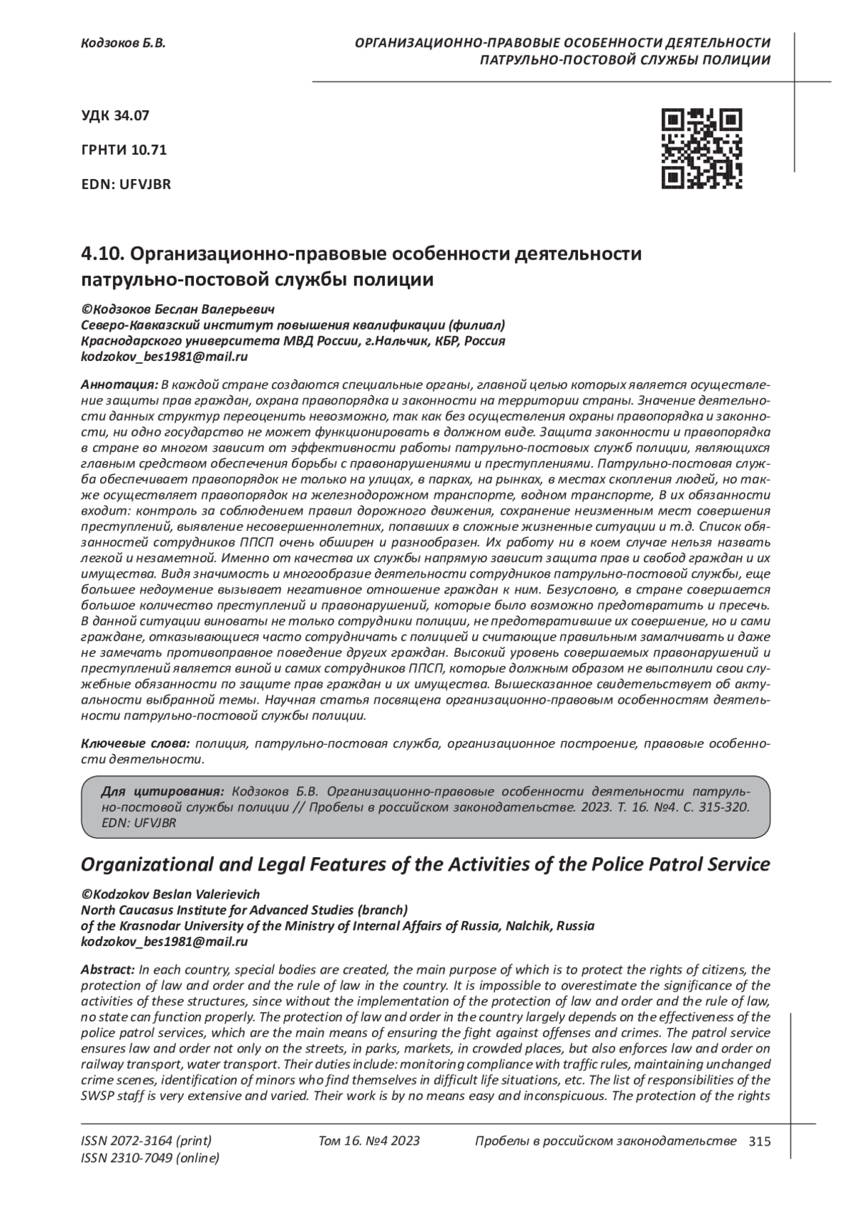 Brazhnikov S.A. The activities of the police patrol service: theory and practice // Police and society: problems and prospects for interaction. 2019. No. 1. Р. 39-44.