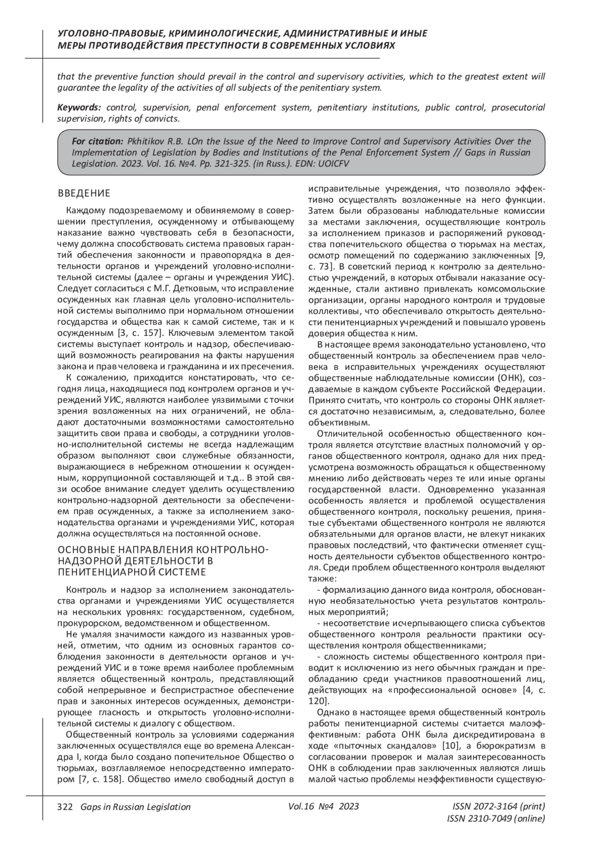 В условиях нестабильной социально-политической обстановки в стране и мире необходимо обращать особое внимание на обеспечение прав наиболее незащищенных категорий граждан, к которым относятся в том числе и осужденные. Обеспечение законности в органах и учреждениях УИС является определяющим критерием эффективности их функционирования. Наиболее действенным способом обеспечения законности в уголовно-исполнительной следует признать контроль и надзор, который в пенитенциарной сфере наиболее широко представлен такими видами как общественный контроль и прокурорский надзор. В последние годы все больше внимания со стороны государства уделяется вопросам совершенствования контрольно-надзорной деятельности в различных сферах жизнедеятельности. В данной статье рассмотрены некоторые проблемные аспекты осуществления контроля и надзора в пенитенциарной системе, а также обозначены направления совершенствования указанной деятельности. В целях обеспечения прав осужденных и исполнения законодательства пенитенциарными учреждениями автором обосновывается целесообразность закрепления возможности осуществления общественного контроля с применением дистанционных технологий. Отмечается, что в контрольно-надзорной деятельности должна превалировать предупредительная функция, которая в наибольшей степени позволит гарантировать законность деятельности всех субъектов уголовно-исполнительной системы.
