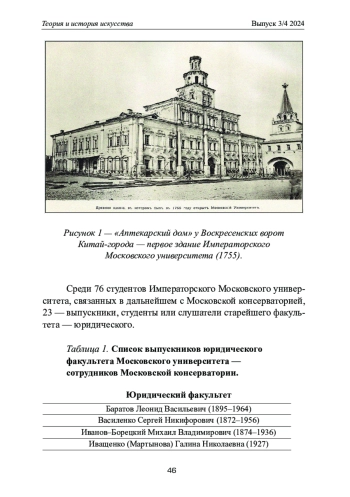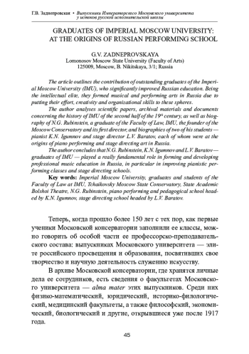 В статье представлена деятельность выдающихся выпускников Императорского Московского университета — элиты российского просвещения и образования, посвятивших свое творчество и организаторскую деятельность служению музыкальному и сценическому искусству. Проанализированы научные труды, архивные материалы, документы, посвященные истории Императорского Московского университета (ИМУ) второй половины XIX века и личной судьбе Н. Г. Рубинштейна — выпускника юридического факультета ИМУ, основателя Московской консерватории и ее первого директора, — а также двух его студентов — пианиста К. Н. Игумнова и режиссера Л. В. Баратова, каждый из которых стоит у истоков фортепианного исполнительского и режиссерского искусства. В результате анализа деятельности трех великих представителей российского искусства — Н. Г. Рубинштейна, К. Н. Игумнова и Л. В. Баратова, обучавшихся в Императорском Московском университете, — автор приходит к выводу об их основополагающей роли в становлении и развитии отечественного профессионального музыкального образования, пианистической исполнительской и сценической режиссерской школ