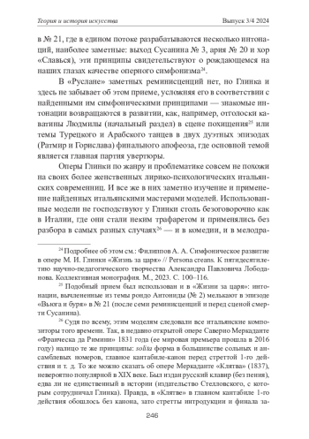 В статье исследуется творческое восприятие Глинкой достижений итальянской романтической оперы 1810–1830-х годов. Отмечено значение пребывания Глинки в Италии и восприятия опер Беллини и Доницетти в общении с авторами и исполнителями. Проанализировано большинство опер Россини, Беллини и Доницетти, отмечены закономерности их драматургии и структуры. Самыми важными для Глинки оказались интродукции и финалы, а также традиционная форма (solita forma) сольных номеров. Подчеркнуто применение канона-кантабиле перед стреттой в финалах первых действий. Показано использование итальянских принципов в сцене Вани из «Жизни за царя» и в трех ариях «Руслана». Новые возможности Глинка нашел в использовании реминисценций. Итальянские традиции стали для Глинки важной опорой, которая помогла композитору выстроить грандиозные здания двух своих новаторских опер