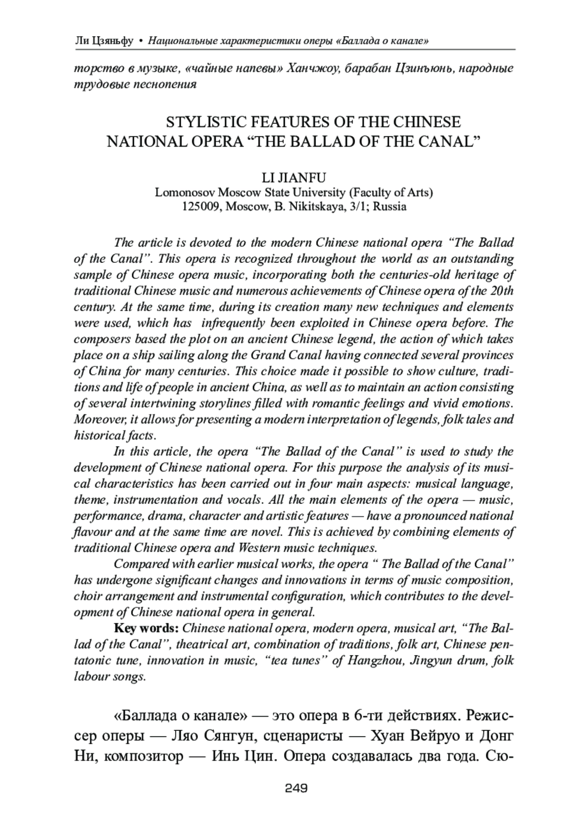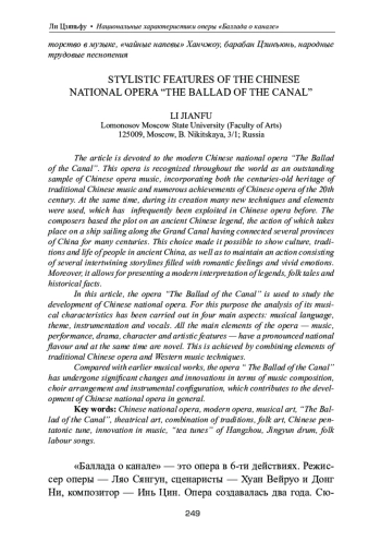 Статья посвящена современной китайской национальной опере «Баллада о канале». Опера «Баллада о канале» признана во всём мире выдающимся музыкальным произведением китайской оперной музыки, вобравшем в себя как многовековое наследие традиционной китайской музыки, так и многочисленные достижения китайского оперного искусства XX века. Вместе с тем, при ее создании было использовано много новых приемов и элементов, почти не встречавшихся ранее в китайской опере. За основу сюжета авторами была взята древняя китайская легенда, действие которой разворачивается на корабле, плывущем по Великому каналу, много веков соединяющему несколько провинций Китая. Такой выбор позволил показать культуру, традиции и жизнь народа в Древнем Китае и развить действие, состоящее из нескольких переплетающихся сюжетных линий, наполненных романтическими чувствами, яркими эмоциями и современной интерпретацией легенд, народных сказок и исторических фактов. В данной статье опера «Баллада о канале» используется для исследования процессов развития китайской национальной оперы для чего проводится анализ ее музыкальных характеристик по четырем основным аспектам: музыкальный язык, тема, инструментовка и вокал. Все основные элементы оперы: музыка, исполнение, драматургия, характер персонажей и художественные особенности имеют ярко выраженный национальный колорит и одновременно обладают новизной. Это достигается с помощью сочетания элементов традиционной китайской оперы и приемов западной музыки. По сравнению с предшествующими ей музыкальными произведениями опера «Баллада о канале» претерпела большие изменения и нововведения с точки зрения создания музыки, аранжировки хора и инструментальной конфигурации, что способствовало развитию китайской национальной оперы в целом