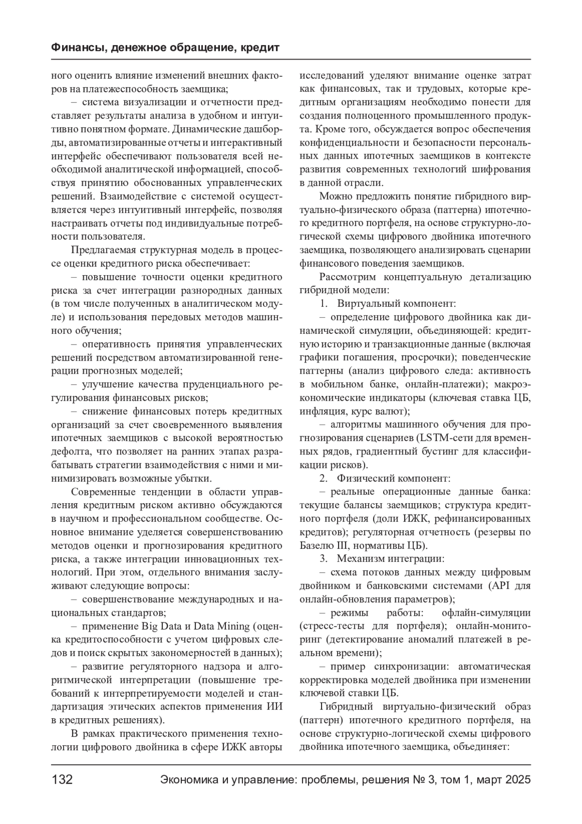 В условиях стремительного развития банковского сектора и изменений в технологической сфере финансового сектора, актуальность предмета исследования определяется необходимостью совершенствования существующих подходов к управлению кредитным риском с использованием современных технологий. В статье проанализированы основные этапы эволюции вопроса кредитного риска и ключевые события в сфере риск-менеджмента, оказавшие влияние на развитие теории вопроса, такие как: Ямайская валютная конференция 1976 года и введение стандартов «Базельские соглашения». Выявлена проблема потребности кредитных организаций в разработке инструментов, способных учесть особенности платежной дисциплины ипотечного заемщика, современные решения в области цифровых технологий и тренды развития методов оценки кредитного риска. Авторами рассмотрена структурно-логическая схема цифрового двойника ипотечного заемщика, позволяющая учесть потребность кредитных организаций в контекстуализации разнородных данных, составлении подробной аналитики текущего и ретро состояния, и прогнозировании будущего финансового поведения ипотечного заемщика. Можно предложить понятие гибридного виртуально-физического образа (паттерна) ипотечного кредитного портфеля, на основе структурно-логической схемы цифрового двойника ипотечного заемщика, позволяющего анализировать сценарии финансового поведения заемщиков, что развивает теорию кредитного риска.