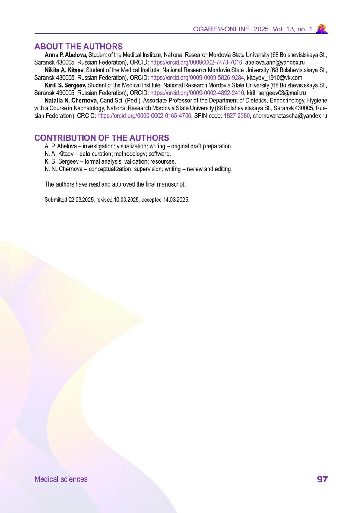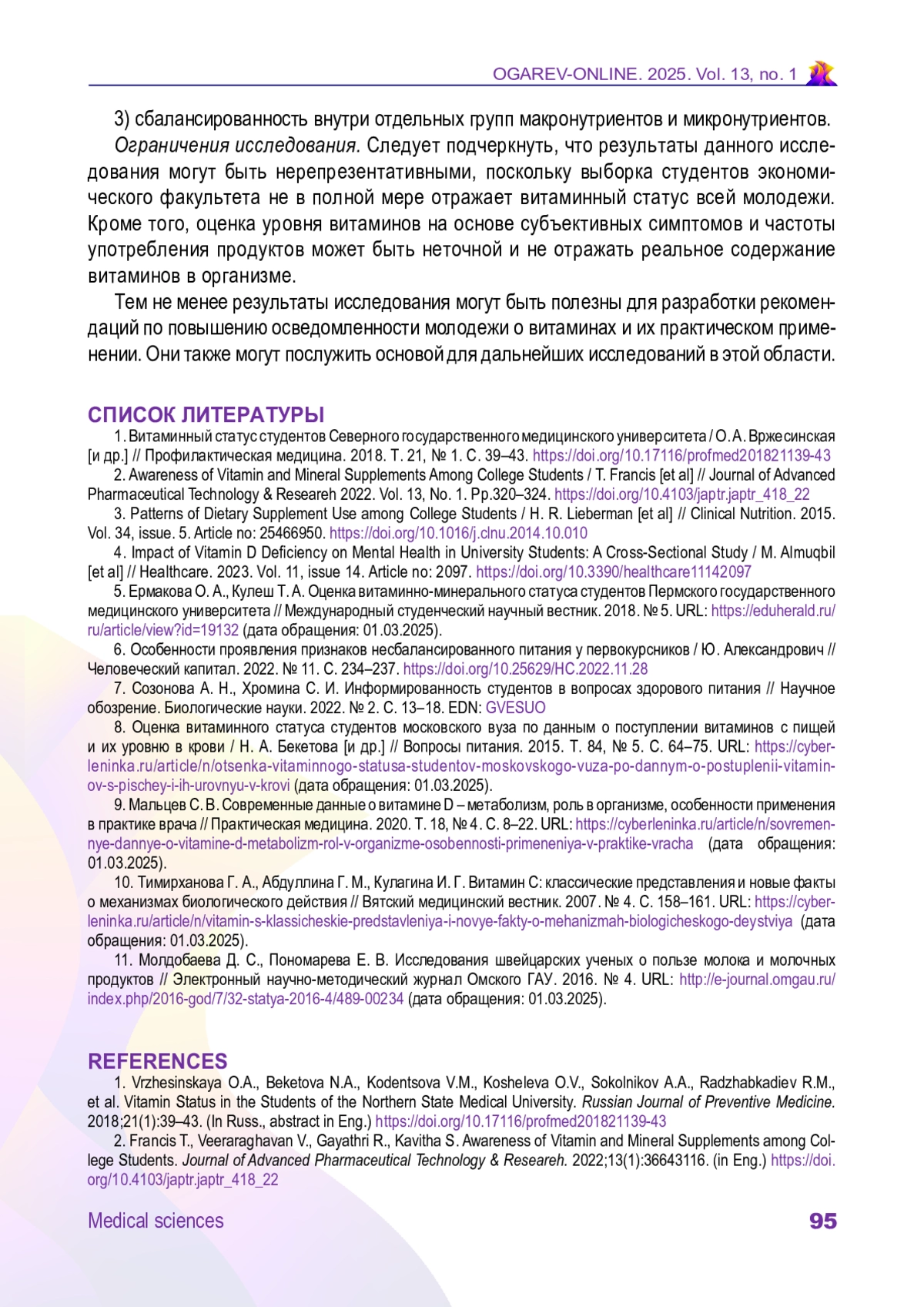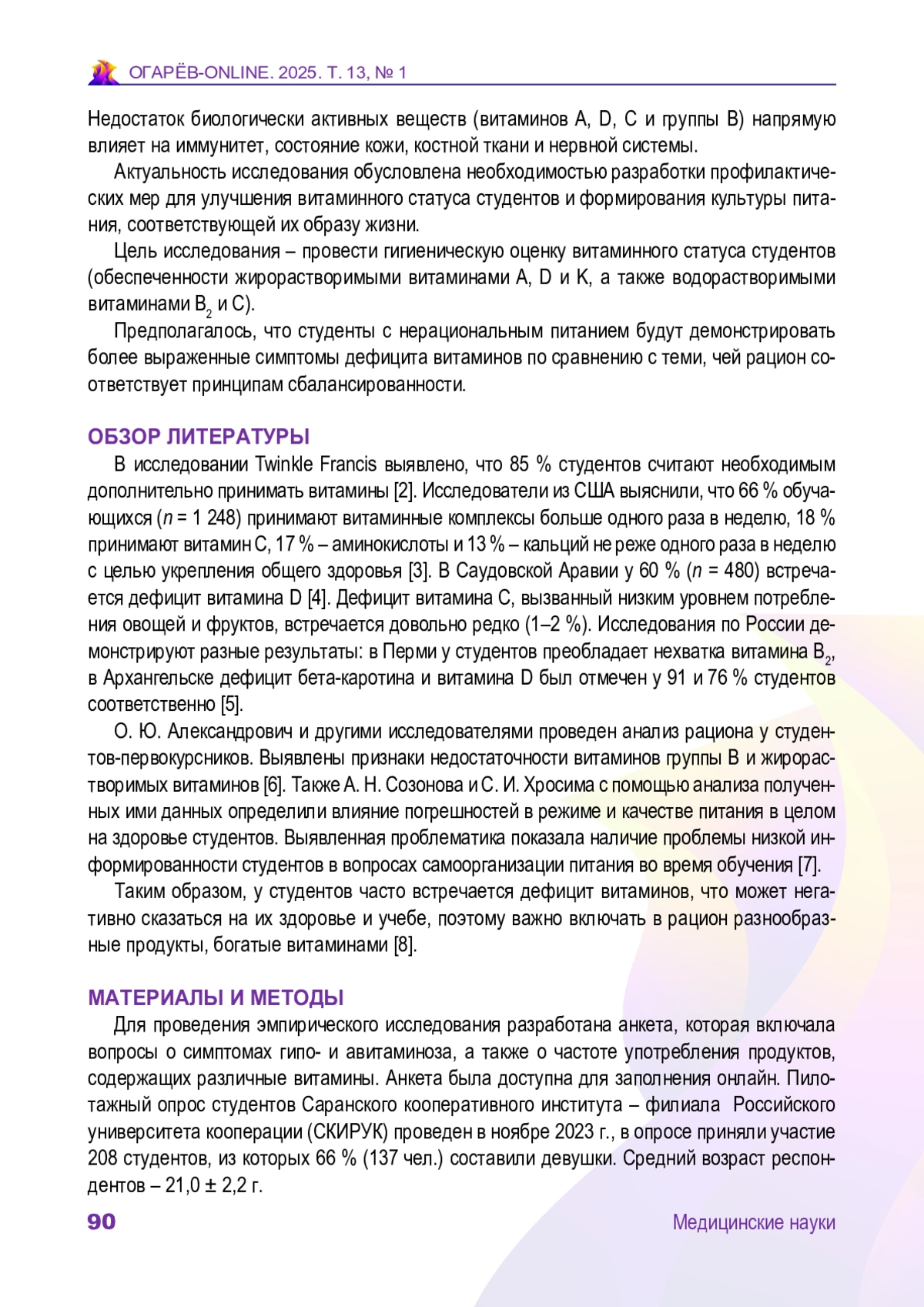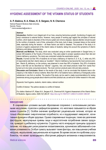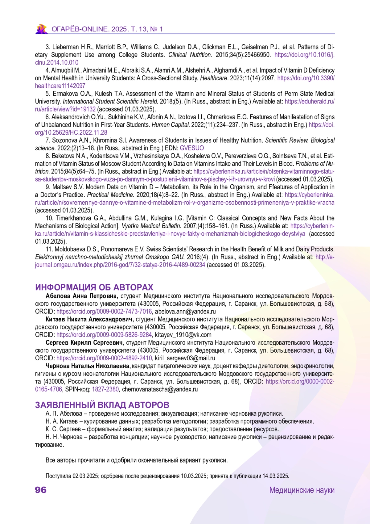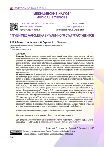 АБЕЛОВА А. П., КИТАЕВ Н. А., СЕРГЕЕВ К. С., ЧЕРНОВА Н. Н. ГИГИЕНИЧЕСКАЯ ОЦЕНКА ВИТАМИННОГО СТАТУСА СТУДЕНТОВ // ОГАРЁВ-ONLINE. 2025. № 1 (218), ТОМ 13