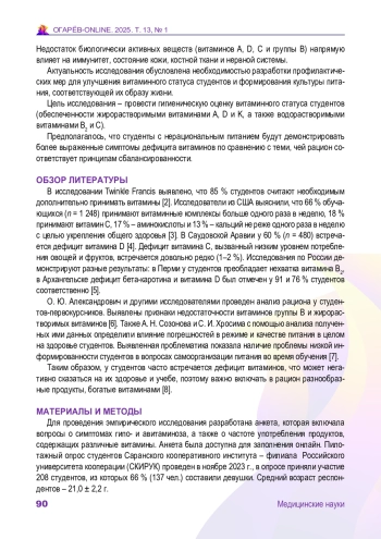 Введение. Питание является неотъемлемой частью нашей жизни, обеспечивает гармоничный рост, функционирование органов и устойчивость организма к внешним факторам. Однако многие люди трудоспособного возраста пренебрегают принципами рационального питания, что приводит к нарушениям иммунной системы и хроническим заболеваниям. Особое внимание следует уделить питанию студентов. Недостаток времени, истощение организма, недосыпание, повышенная нагрузка на психическое состояние, особенно во время сессии, могут привести к заболеваниям. Цель исследования – провести гигиеническую оценку витаминного статуса студентов с учетом симптомов дефицита витаминов и особенностей рациона питания.