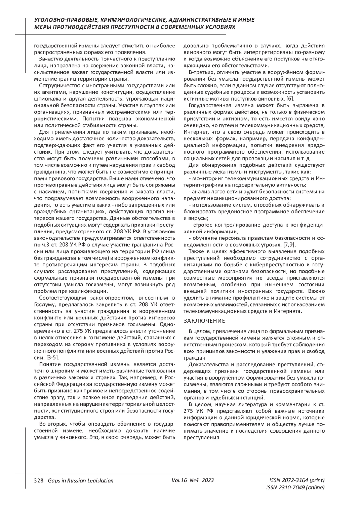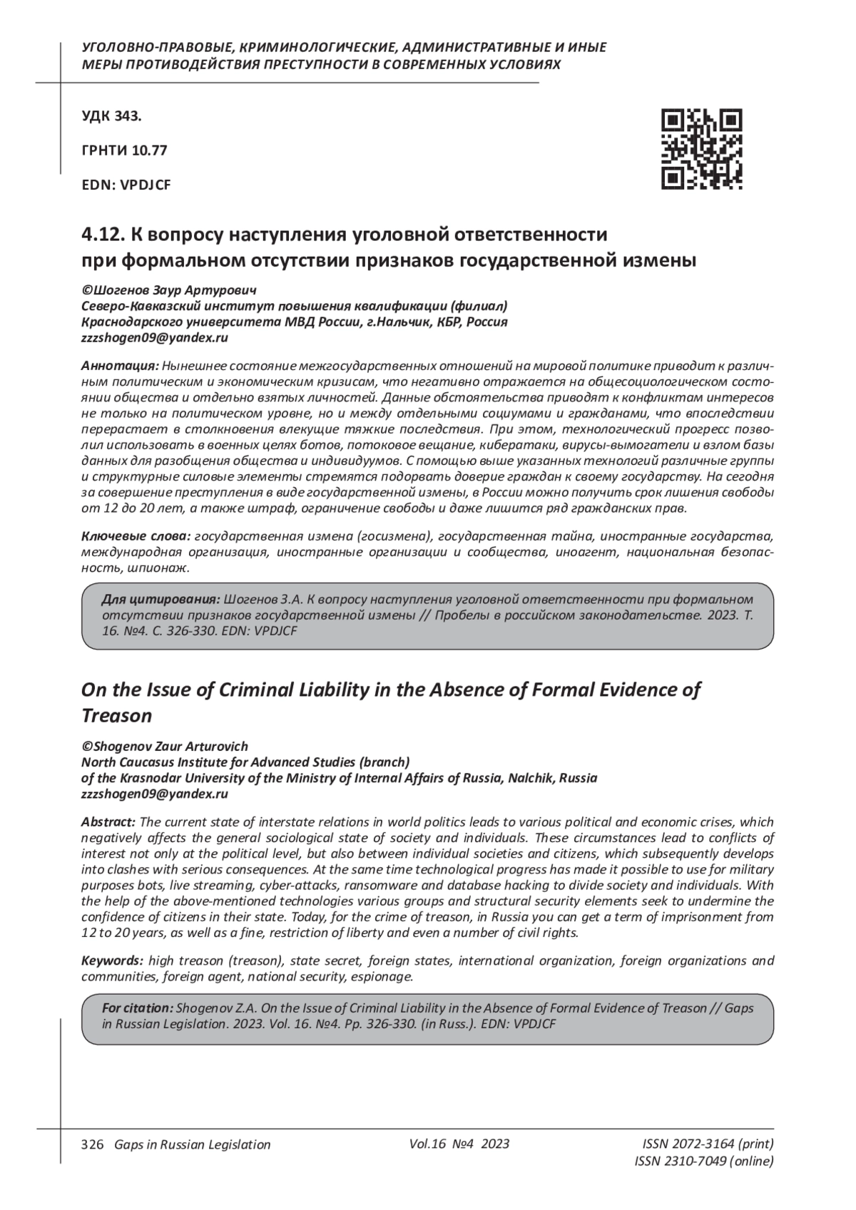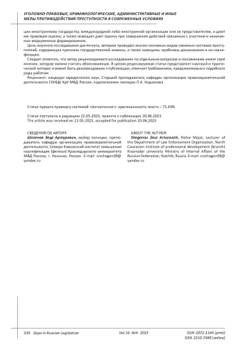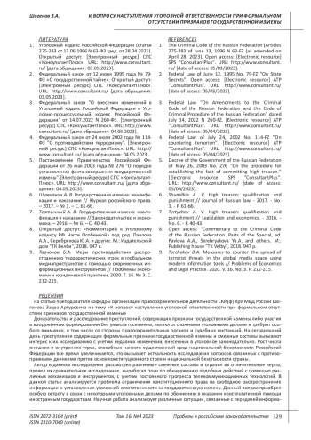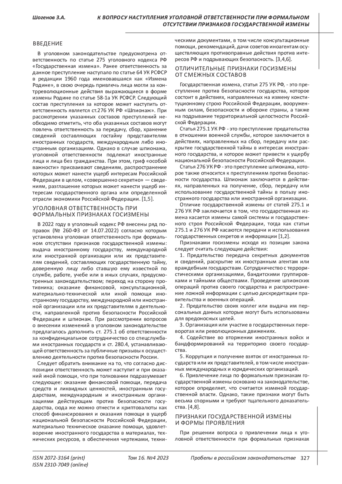 ШОГЕНОВ З. А. К ВОПРОСУ НАСТУПЛЕНИЯ УГОЛОВНОЙ ОТВЕТСТВЕННОСТИ ПРИ ФОРМАЛЬНОМ ОТСУТСТВИИ ПРИЗНАКОВ ГОСУДАРСТВЕННОЙ ИЗМЕНЫ // ПРОБЕЛЫ В РОССИЙСКОМ ЗАКОНОДАТЕЛЬСТВЕ. 2023. Т. 16 № 4