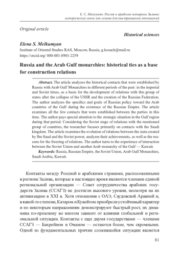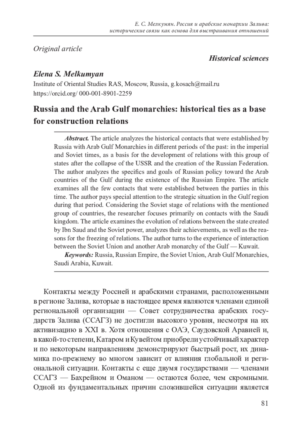 МЕЛКУМЯН Е. С. РОССИЯ И АРАБСКИЕ МОНАРХИИ ЗАЛИВА: ИСТОРИЧЕСКИЕ СВЯЗИ КАК ОСНОВА ДЛЯ ВЫСТРАИВАНИЯ ОТНОШЕНИЙ // НЕСТАБИЛЬНОСТЬ ГЕОСТРАТЕГИЧЕСКОГО ПРОСТРАНСТВА НА БЛИЖНЕМ, СРЕДНЕМ И ДАЛЬНЕМ ВОСТОКЕ: АКТУАЛЬНЫЕ ПРОБЛЕМЫ. 2022. № 9