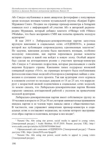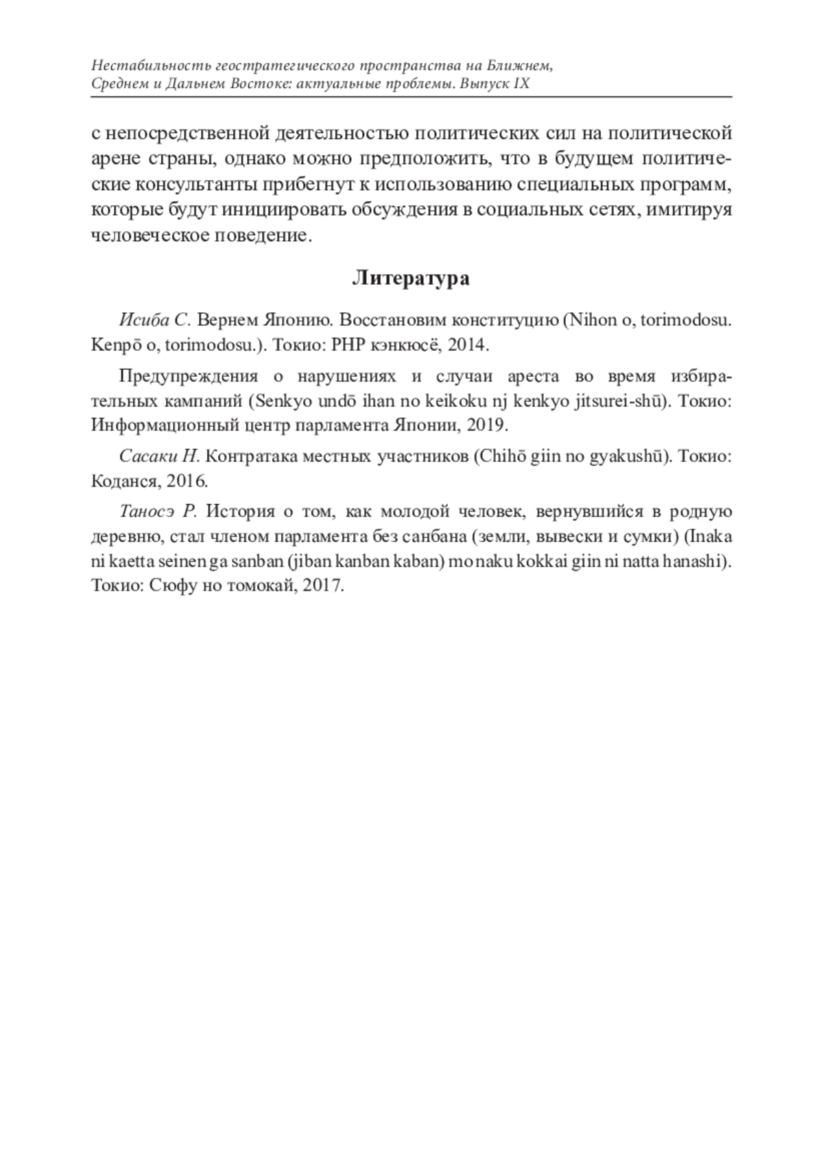 РОМАНОВА И. А. ВЛИЯНИЕ ПОЛИТИЧЕСКИХ ТЕХНОЛОГИЙ НА ЭЛЕКТОРАЛЬНЫЙ ПРОЦЕСС В ЯПОНИИ // НЕСТАБИЛЬНОСТЬ ГЕОСТРАТЕГИЧЕСКОГО ПРОСТРАНСТВА НА БЛИЖНЕМ, СРЕДНЕМ И ДАЛЬНЕМ ВОСТОКЕ: АКТУАЛЬНЫЕ ПРОБЛЕМЫ. 2022. № 9