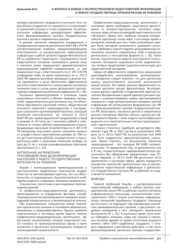 Информационное воздействие в настоящее время позволяет оперативно организовывать общественную реакцию на происходящие государственные и социальные процессы. Указанная тенденция наглядно проявляется в рамках антироссийской информационно-пропагандисткой деятельности, которая весьма активно осуществляется в настоящее время в условиях обострения геополитического конфликта между Россией и Украиной и проведением специальной военной операции. В данном контексте справедливым видится совершенствование отраслевого законодательства в части закрепления ответственности не только за распространение заведомо ложных сведений об использовании Вооруженных Сил РФ, но и о функционировании органов государственной власти РФ на территории зарубежных государств. Учитывая значимость деятельности вышеназванных государственных органов по обеспечению и охране прав и законных интересов граждан РФ за рубежом, подобное противоправное поведение представляет существенную общественную опасность. Целью представленного исследования выступает анализ современных механизмов борьбы с распространением недостоверной информации о работе государственных органов России за рубежом. Автор приходит к выводу о том, что борьба с анализируемыми правонарушениями и преступлениями предполагает комплексное воздействие как на противоправную практику, так и на обстоятельства, ее порождающие. Акцентируется внимание на необходимости переориентации профилактико-предупредительной деятельности на интернет-пространство, в том числе всесторонне использование потенциала социальных сетей и видеохостингов. Отмечается важнейшее практическое значение повышения уровня информационной грамотности российского населения в части тщательного выбора информационных источников и формирования должной реакции при выявлении заведомо ложных сведений.