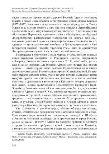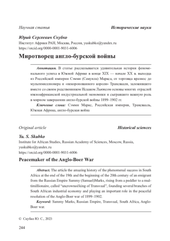 В статье рассказывается удивительная история феноменального успеха в Южной Африке в конце XIX — начале XX в. выходца из Российской империи Сэмми (Самуила) Маркса, от торговца вразнос до мультимиллионера и «некоронованного короля» Трансвааля, заложившего вместе со своим родственником Исааком Льюисом основы многих отраслей южноафриканской индустриальной экономики и сыгравшего важную роль в мирном завершении англо-бурской войны 1899–1902 гг.