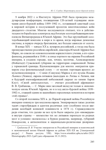 9 ноября 2022 г. в Институте Африки РАН была проведена международная конференция, посвященная 120-летней годовщине окончания англо-бурской войны 1899–1902 гг., оставившей заметный след в мировой истории и послужившей прологом многочисленных войн двадцатого столетия. Многие исследователи считают, что в действительности борьба шла за контроль над богатым золотодобывающим комплексом Витватерсранда в Южной Африке. Это был крупнейший золотодобывающий комплекс в мире в то время, когда мировые денежные системы, в первую очередь британские, все больше зависели от золота.