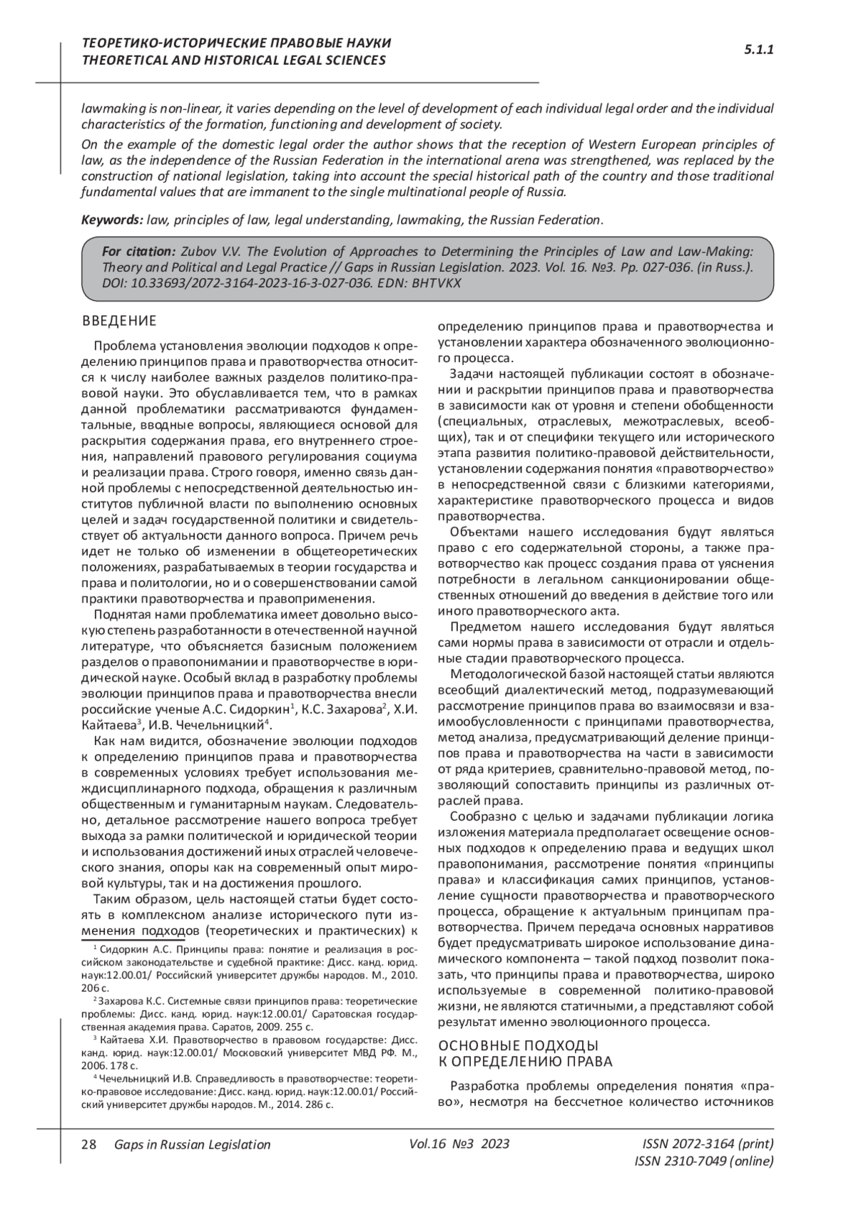 В предложенной публикации проводится комплексное рассмотрение исторического пути изменения подходов (теоретических и практических) к определению принципов права и правотворчества и устанавливается характер эволюционного процесса в политико-правовой материи. На основе всеобщего диалектического метода, анализа и сравнительно-правового подхода обозначаются и раскрываются принципы права и правотворчества в зависимости как от уровня и степени обобщенности (специальные, отраслевые, межотраслевые, всеобщие), так и от специфики текущего или исторического этапа развития политико-правовой действительности, устанавливается содержание понятия «правотворчество» в непосредственной связи с близкими категориями, характеризуется правотворческий процесс и виды правотворчества. По ходу изложения материала автор устанавливает, что актуальное российское право строится на синтезе достижений основных концепций правопонимания - естественноправовой доктрины, позитивизма и реалистической школы права. Обозначается, что в течение последних лет принципы права в России эволюционируют на фоне неуклонной суверенизации отечественного политического и правового порядка. Дается определение правотворчества как целенаправленной деятельности компетентных органов по изменению, установлению или отмене правовых норм, являющейся высшей формой выражения процесса правообразования и составным элементом нормотворчества, устанавливается, что принципы правотворчества должны коррелировать с актуальными принципами права. В заключении статьи делается вывод о том, что эволюция принципов права и правотворчества носит нелинейный характер, она варьируется в зависимости от уровня развития каждого отдельного правопорядка и индивидуальных особенностей становления, функционирования и развития социума. На примере отечественного правопорядка автор показывает, что рецепция западноевропейских принципов права по мере укрепления независимости Российской Федерации на международной арене сменилась построением национального законодательства с учетом особого исторического пути страны и тех традиционных фундаментальных ценностей, которые имманентны единому многонациональному народу России.