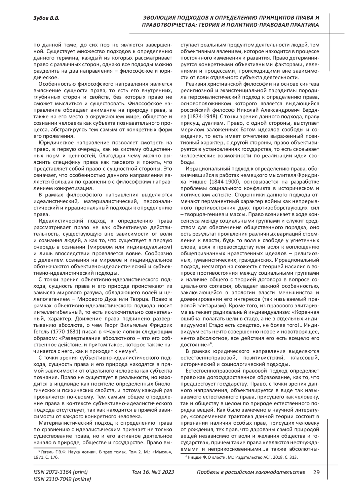 В заключение параграфа обратим внимание на связь принципов права со школами правопонимания и подходами к определению права. Так, общеправовые принципы права, отвечающие высоким этико-культурным стандартам цивилизации, основываются на достижениях, в первую очередь, естественноправовой школы правопонимания, позитивистский подход к определению права находит свое выражение в принципах уголовного права, принципы гражданского права, учитывая интересы субъектов правоотношения, основываются на достижениях реалистической школы права. Таким образом, можно сделать вывод о том, что доктринальное исследование специфики права, помимо дидактического, имеет и прикладной характер, проявляющийся в формировании принципов права, на основании которых и происходит правовое регулирование общественных отношений.