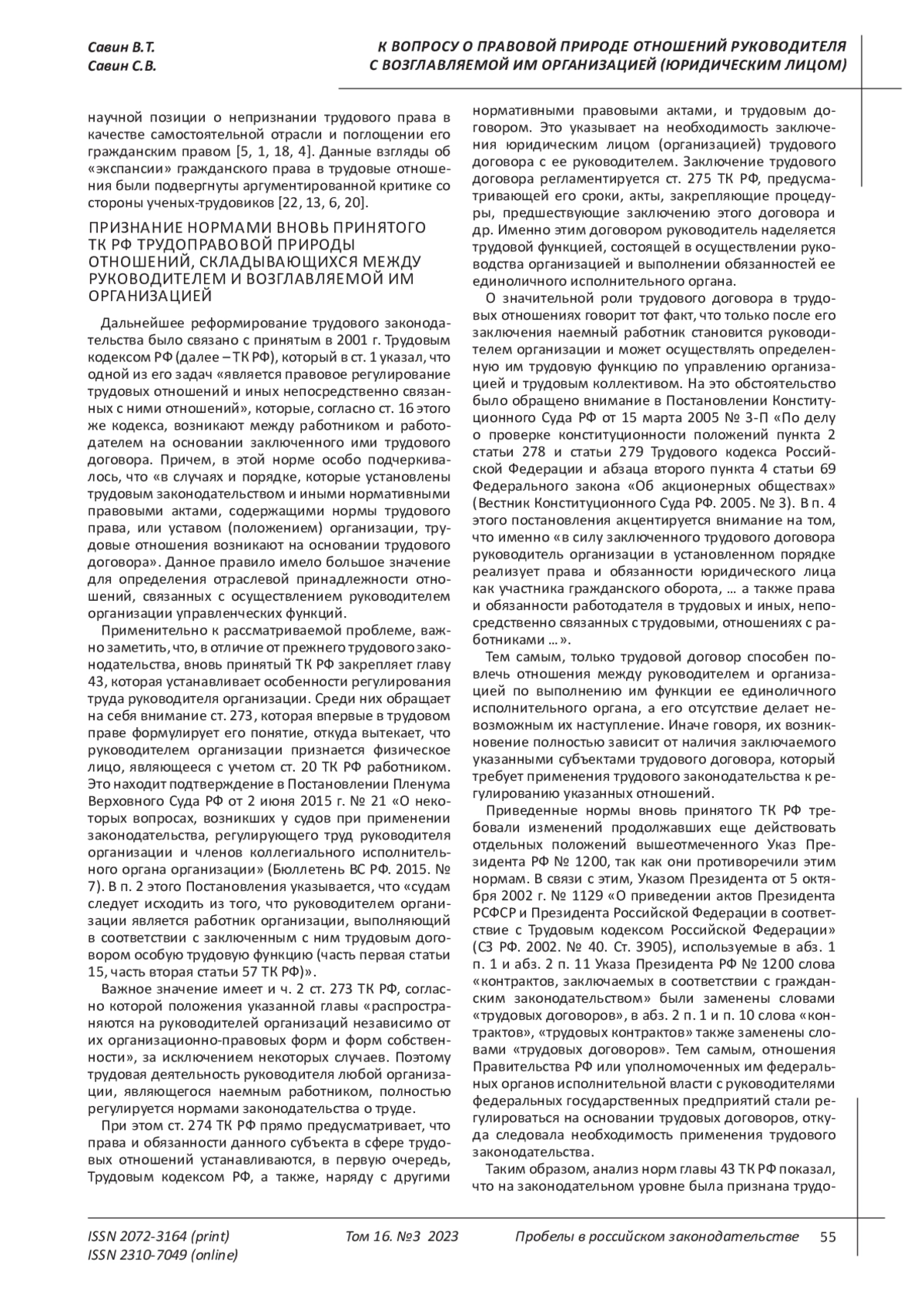 2. Акопов Д. Правовое регулирование труда руководителей организаций по новому Трудовому кодексу Российской Федерации // Хозяйство и право. 2002. N 9. С. 100.