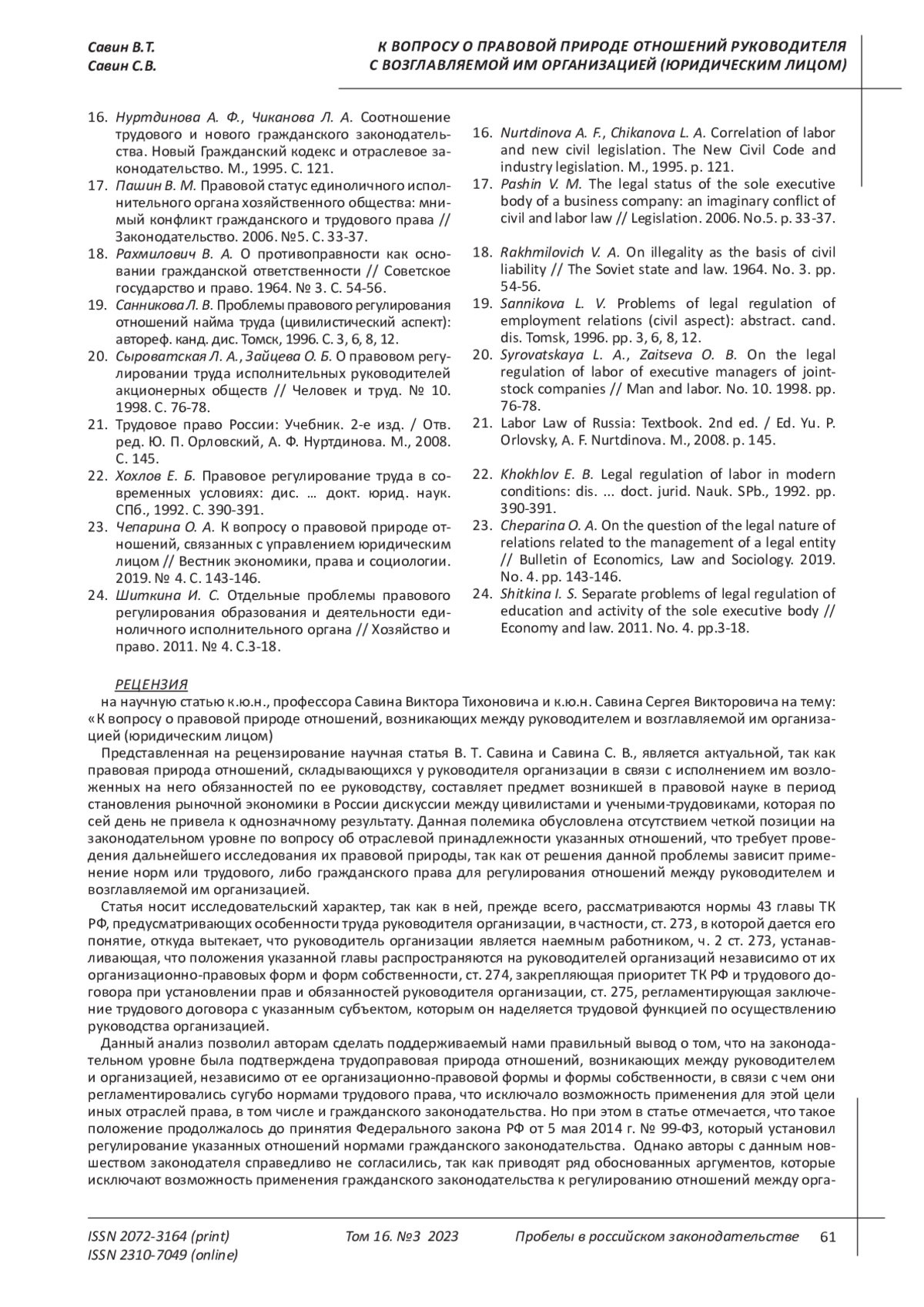 20. Сыроватская Л. А., Зайцева О. Б. О правовом регулировании труда исполнительных руководителей акционерных обществ // Человек и труд. № 10. 1998. С. 76-78.