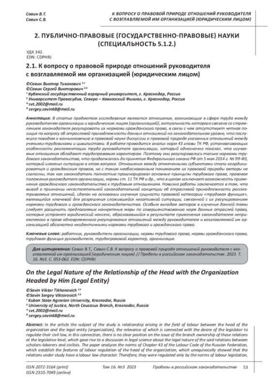 Akopov D. Legal regulation of labor of heads of organizations under the new Labor Code of the Russian Federation // Economy and law. 2002. N 9. p. 100.