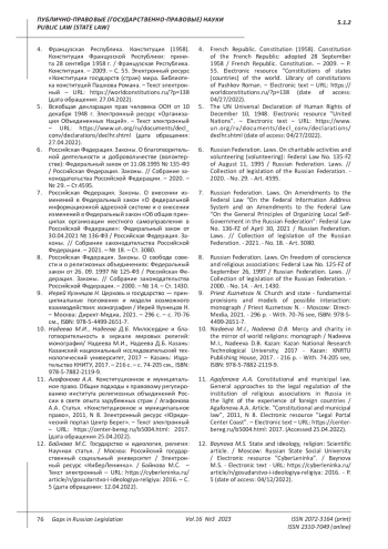 Agafonova A.A. Constitutional and municipal law. General approaches to the legal regulation of the institution of religious associations in Russia in the light of the experience of foreign countries / Agafonova A.A. Article. “Constitutional and municipal law”, 2011, N 8. Electronic resource “Legal Portal Center Coast”. - Electronic text - URL: https://center-bereg.ru/b5004.html: 2017. (Accessed 25.04.2022).