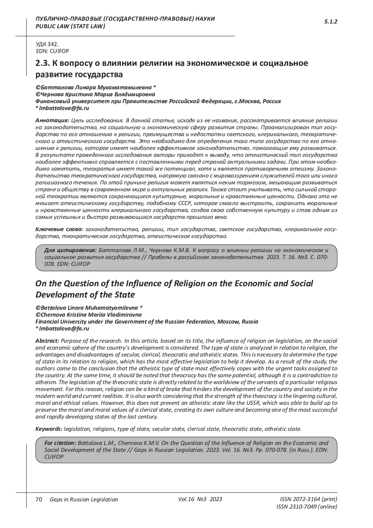 Цель исследования. В данной статье, исходя из ее названия, рассматривается влияние религии на законодательство, на социальную и экономическую сферу развития страны. Проанализирован тип государства по его отношению к религии, преимущества и недостатки светского, клерикального, теократического и атеистического государств. Это необходимо для определения того типа государства по его отношению к религии, которое имеет наиболее эффективное законодательство, помогающие ему развиваться. В результате проведенного исследования авторы приходят к выводу, что атеистический тип государства наиболее эффективно справляется с поставленными перед страной актуальными задачи. При этом необходимо заметить, теократия имеет такой же потенциал, хотя и является противоречием атеизму. Законодательство теократического государства, напрямую связано с мировоззрением служителей того или иного религиозного течения. По этой причине религия может являться неким тормозом, мешающим развиваться стране и обществу в современном мире и актуальных реалиях. Также стоит учитывать, что сильной стороной теократии являются сохраняющиеся культурные, моральные и нравственные ценности. Однако это не мешает атеистическому государству, подобному СССР, которое смогло выстроить, сохранить моральные и нравственные ценности клерикального государства, создав свою собственную культуру и став одним из самых успешных и быстро развивающихся государств прошлого века.