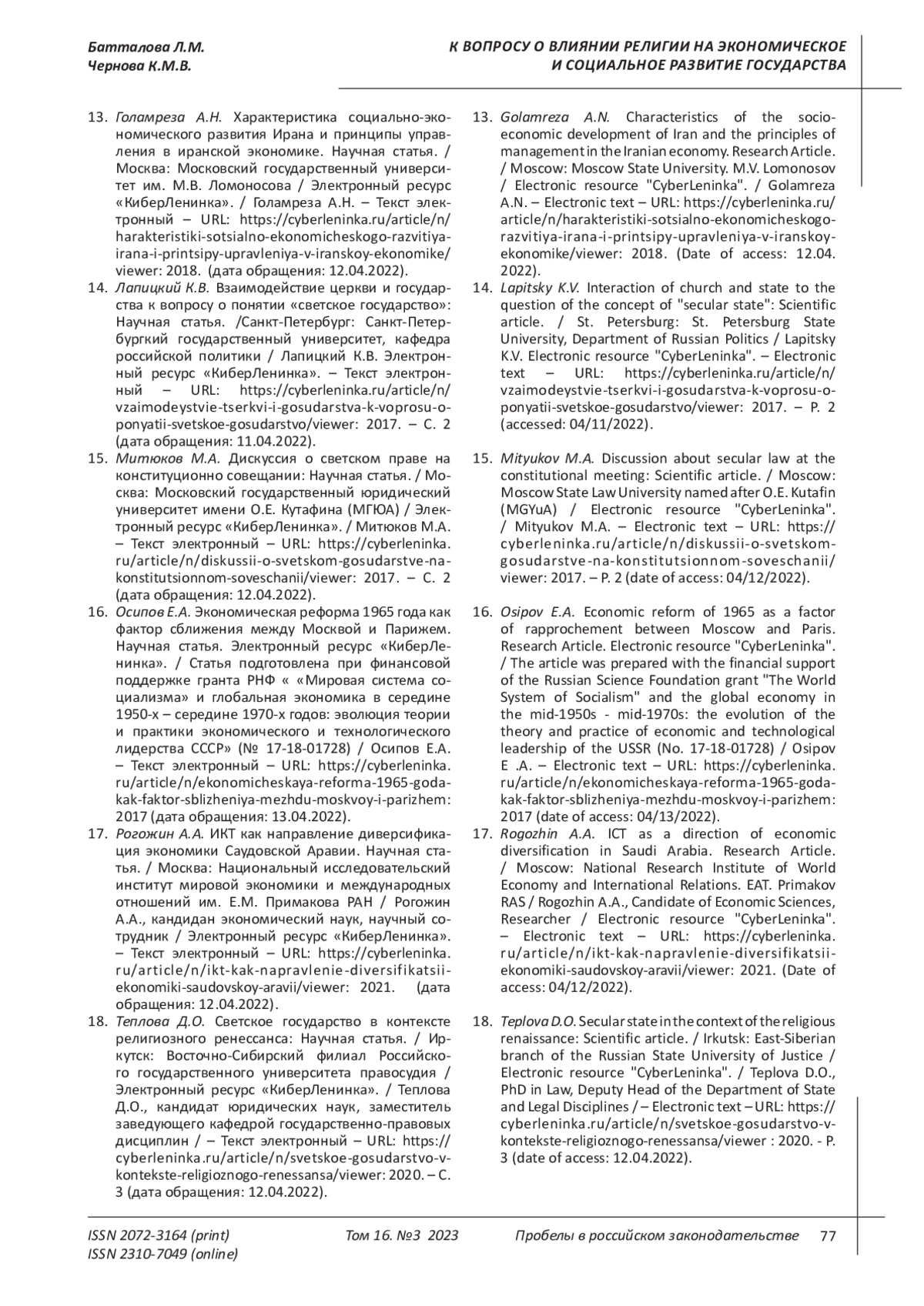 18. Теплова Д.О. Светское государство в контексте религиозного ренессанса: Научная статья. / Иркутск: Восточно-Сибирский филиал Российского государственного университета правосудия / Электронный ресурс “КиберЛенинка”. / Теплова Д.О., кандидат юридических наук, заместитель заведующего кафедрой государственно-правовых дисциплин / - Текст электронный - URL: https://cyberleninka.ru/article/n/svetskoe-gosudarstvo-v-kontekste-religioznogo-renessansa/viewer: 2020. - С. 3 (дата обращения: 12.04.2022).