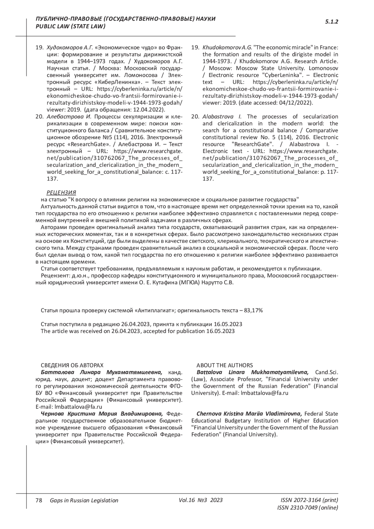 Alabastrova I. The processes of secularization and clericalization in the modern world: the search for a constitutional balance / Comparative constitutional review No. 5 (114), 2016. Electronic resource “ResearchGate”. / Alabastrova I. - Electronic text - URL: https://www.researchgate.net/publication/310762067_The_processes_of_secularization_and_clericalization_in_the_modern_world_seeking_for_a_constitutional_balance: p. 117-137.