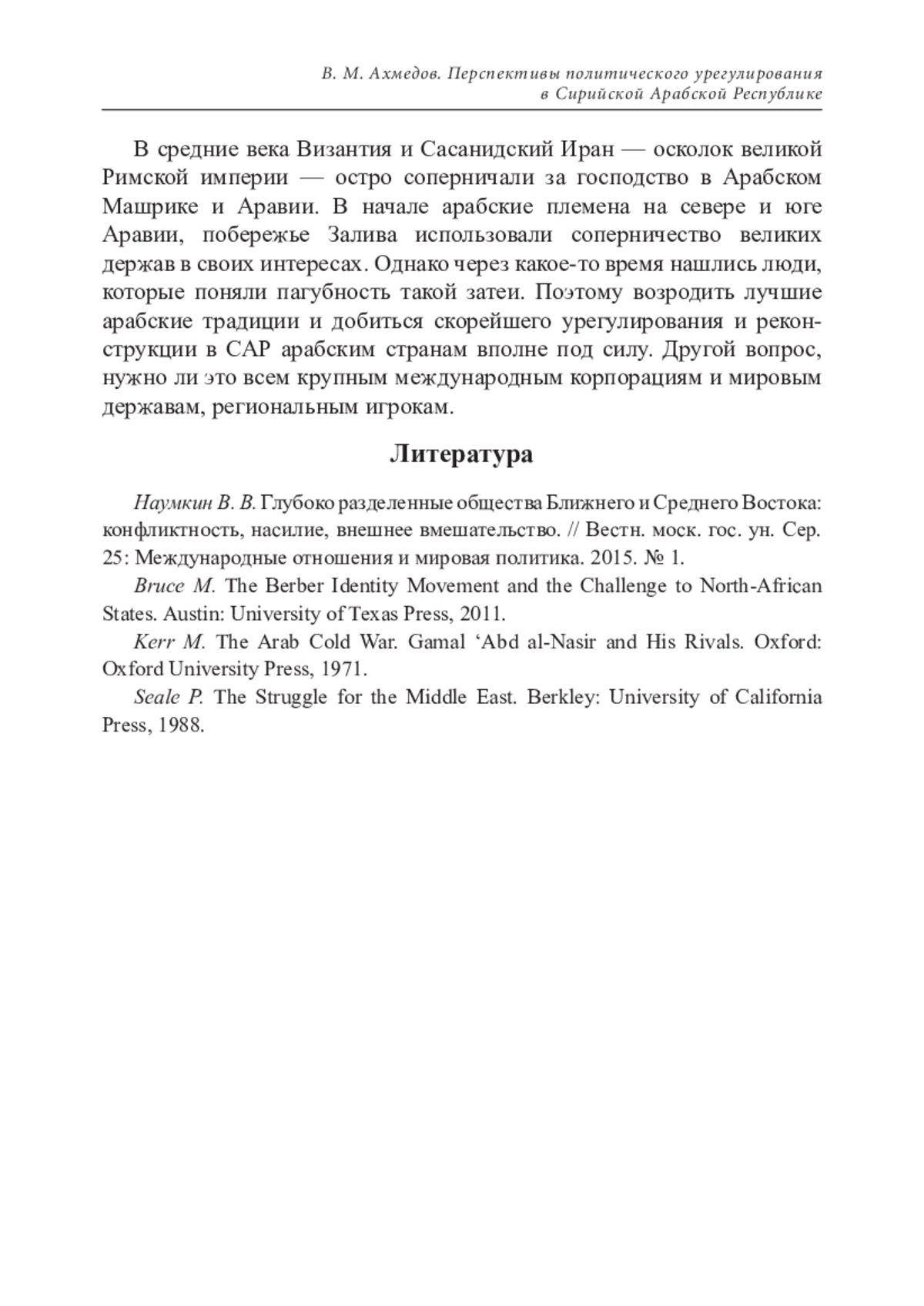 1. Наумкин В. В. Глубоко разделенные общества Ближнего и Среднего Востока: конфликтность, насилие, внешнее вмешательство. // Вестн. моск. гос. ун. Сер. 25: Международные отношения и мировая политика. 2015. № 1.