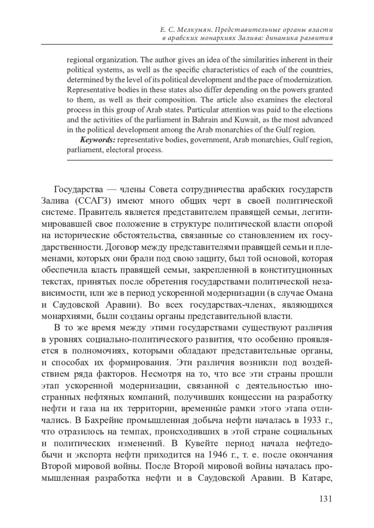 В статье анализируется процесс формирования представительных органов власти в арабских монархиях Персидского залива − членов региональной организации ССАГЗ. Автор дает представление о схожих чертах, присущих их политическим системам, а также об особенностях каждой из рассматриваемых стран, определявшейся уровнем ее политического развития и темпами модернизации. Представительные органы в этих государствах также различаются в зависимости от предоставленных им полномочий, а также их состава. В статье также рассматривается электоральный процесс в этой группе арабских государств. Особое внимание было уделено выборам и деятельности парламента в Бахрейне и Кувейте как наиболее продвинутых в политическом развитии арабских монархий региона Залива.