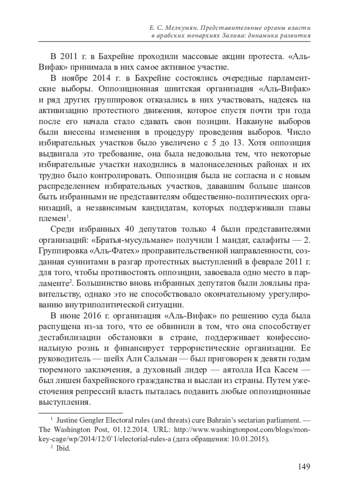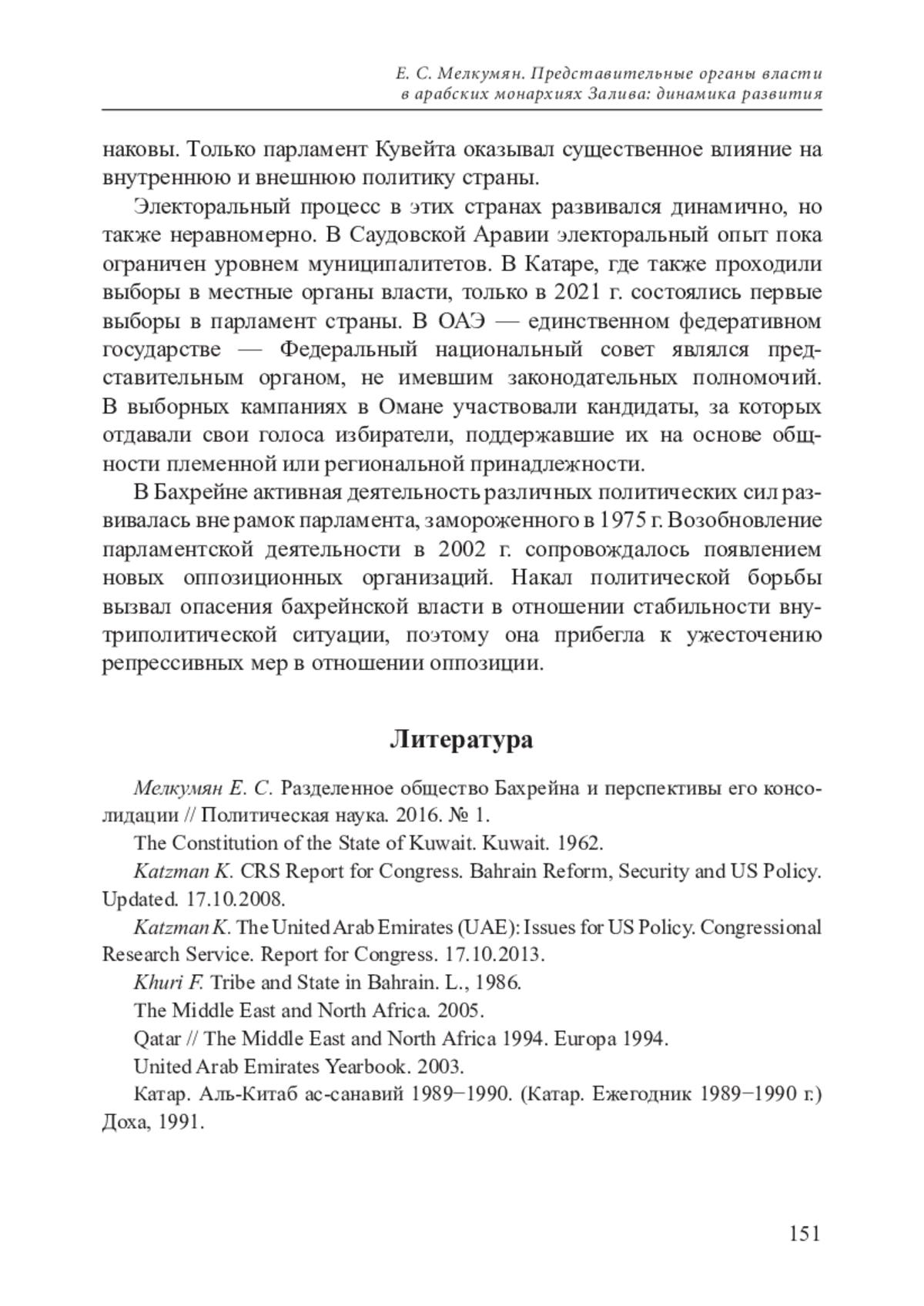1. Мелкумян Е. С. Разделенное общество Бахрейна и перспективы его консолидации // Политическая наука. 2016. № 1.