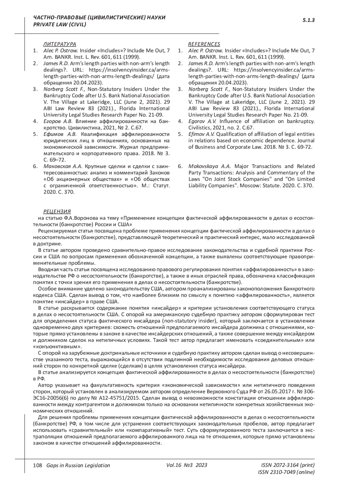 Egorov A.V. Influence of affiliation on bankruptcy. Civilistics, 2021, no. 2. С.67.