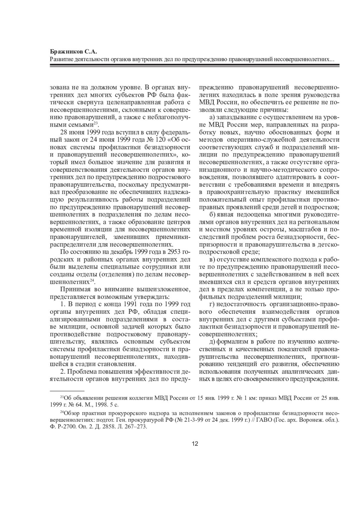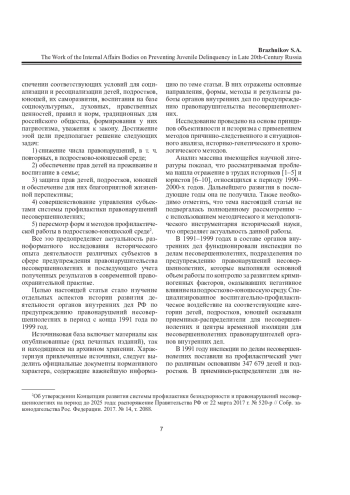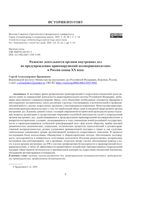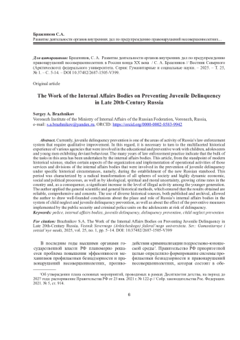 В настоящее время профилактика правонарушений в подростково-юношеской среде является одним из направлений деятельности правоохранительной системы Российской Федерации, требующих качественного совершенствования. Ввиду этого объективно необходимым становится обращение к многогранному историческому опыту различных структур, участвовавших в воспитательной и профилактической работе с детьми, подростками, юношами с отклоняющимся поведением. Многолетняя правоохранительная практика свидетельствует о том, что наибольший объем задач в указанной сфере решают органы внутренних дел. В рамках данной статьи с позиций современной исторической науки рассмотрены отдельные вопросы организации и осуществления оперативно-служебной деятельности служб и подразделений органов внутренних дел, задействовавшихся в предупреждении правонарушений несовершеннолетних в конкретно-исторических условиях, складывавшихся в годы становления новой российской государственности и характеризовавшихся глобальной трансформацией всех сфер жизни общества, крайне высокой динамичностью экономических, социальных, политических процессов, идеологической и духовно-нравственной неопределенностью, резким ухудшением криминогенной ситуации в стране и, как следствие, значительным повышением уровня противоправной активности подраставшего поколения. В процессе исследования были использованы общенаучные и общеисторические методы, обеспечившие достоверность, всесторонность и конкретность полученных результатов. Изучение разноплановых исторических источников, как опубликованных, так и архивных, позволило автору сделать обоснованные выводы о месте и роли органов внутренних дел РФ в системе профилактики безнадзорности и правонарушений несовершеннолетних, а также об эффективности превентивного воздействия заинтересованных подразделений милиции общественной безопасности и криминальной милиции на подростково-юношеский контингент, обладавший противоправным потенциалом.