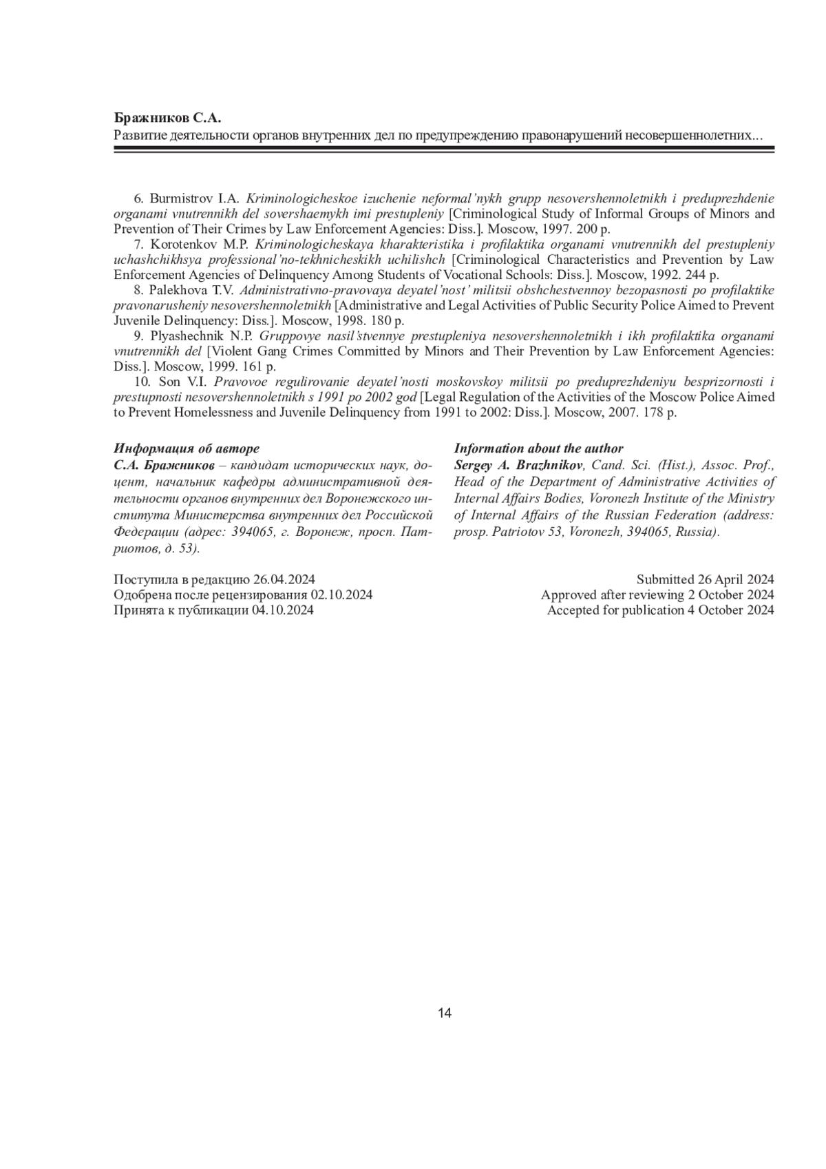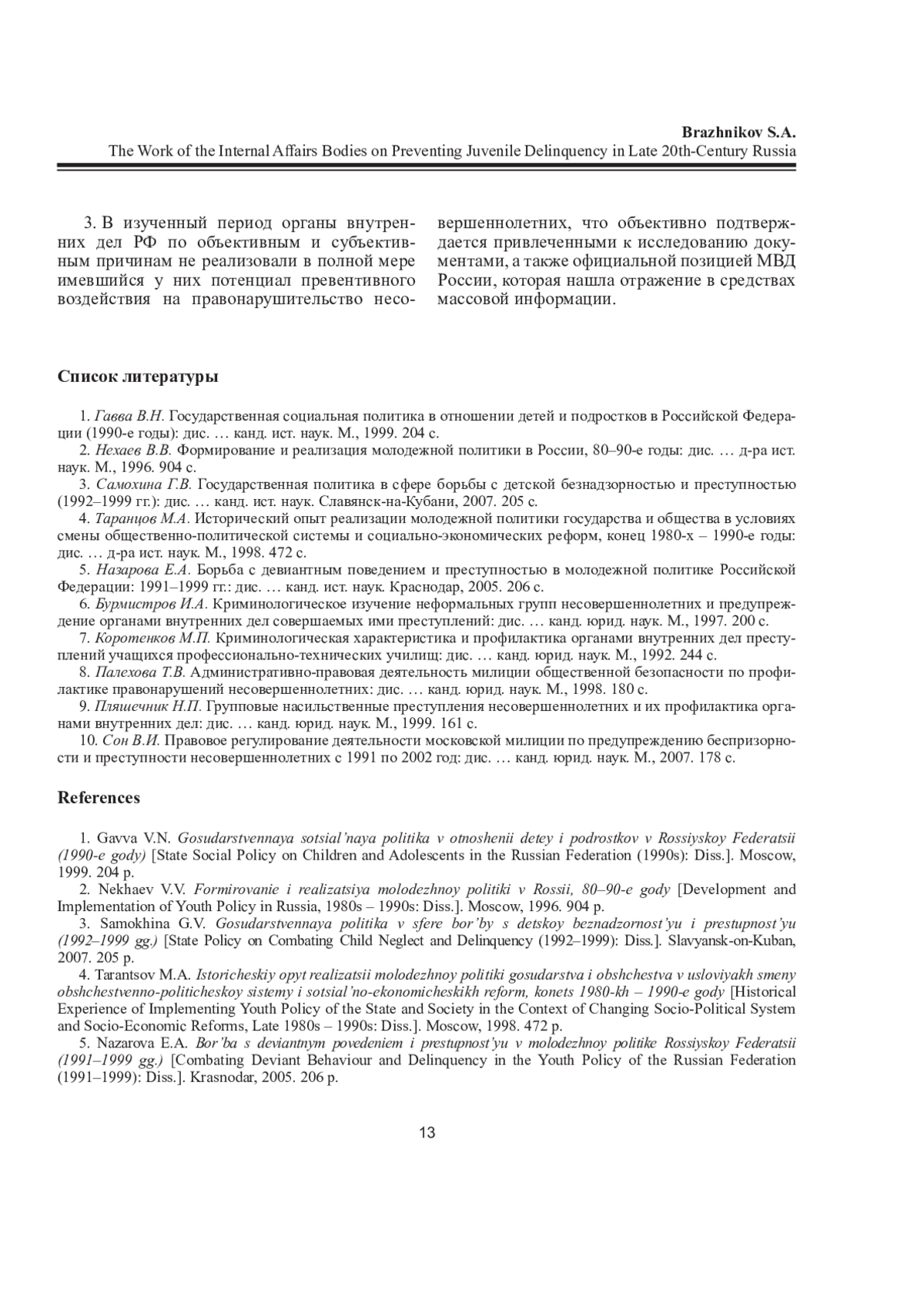 10. Сон В.И. Правовое регулирование деятельности московской милиции по предупреждению беспризорности и преступности несовершеннолетних с 1991 по 2002 год: дис.... канд. юрид. наук. М., 2007. 178 с. EDN: NOZDXV