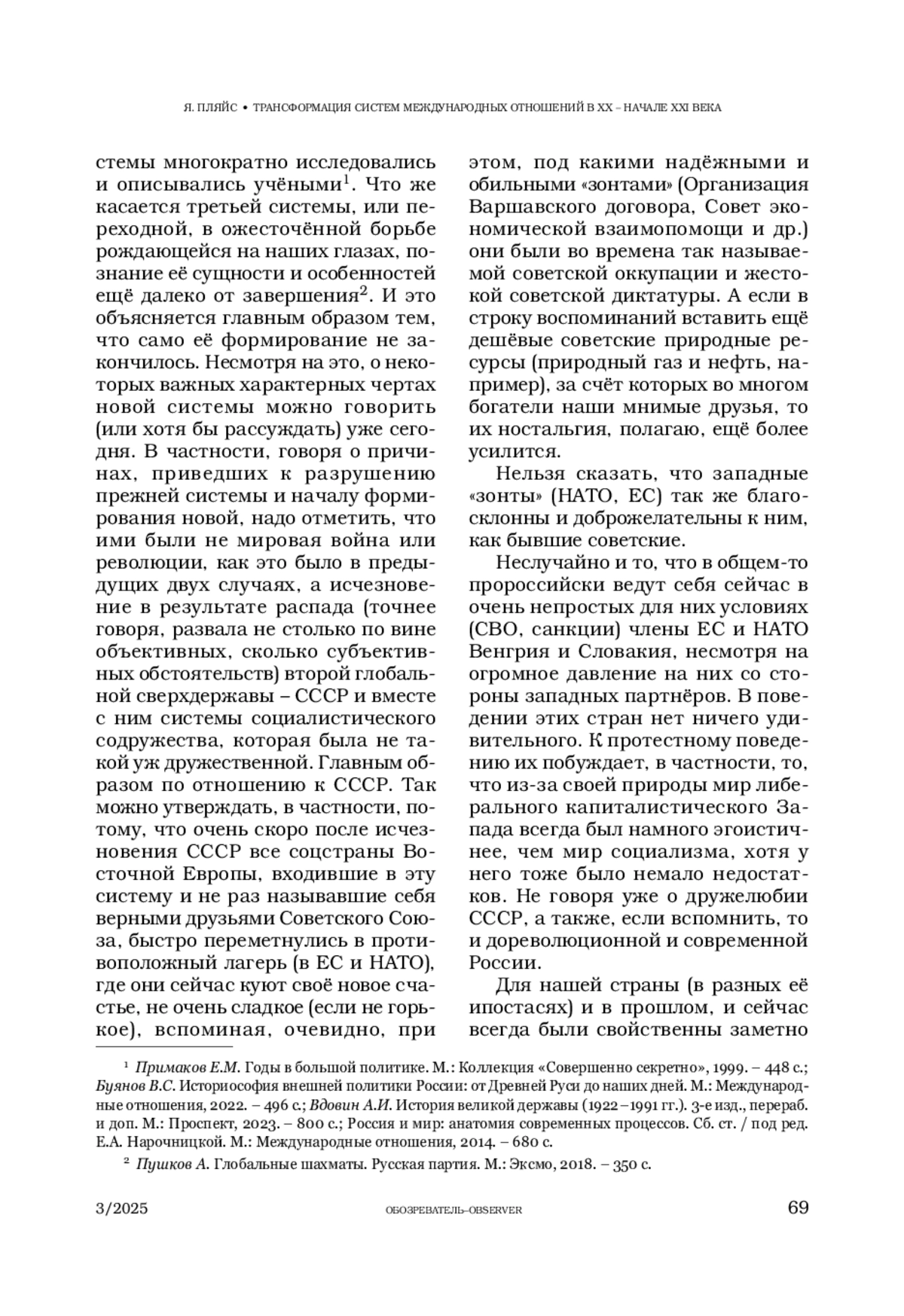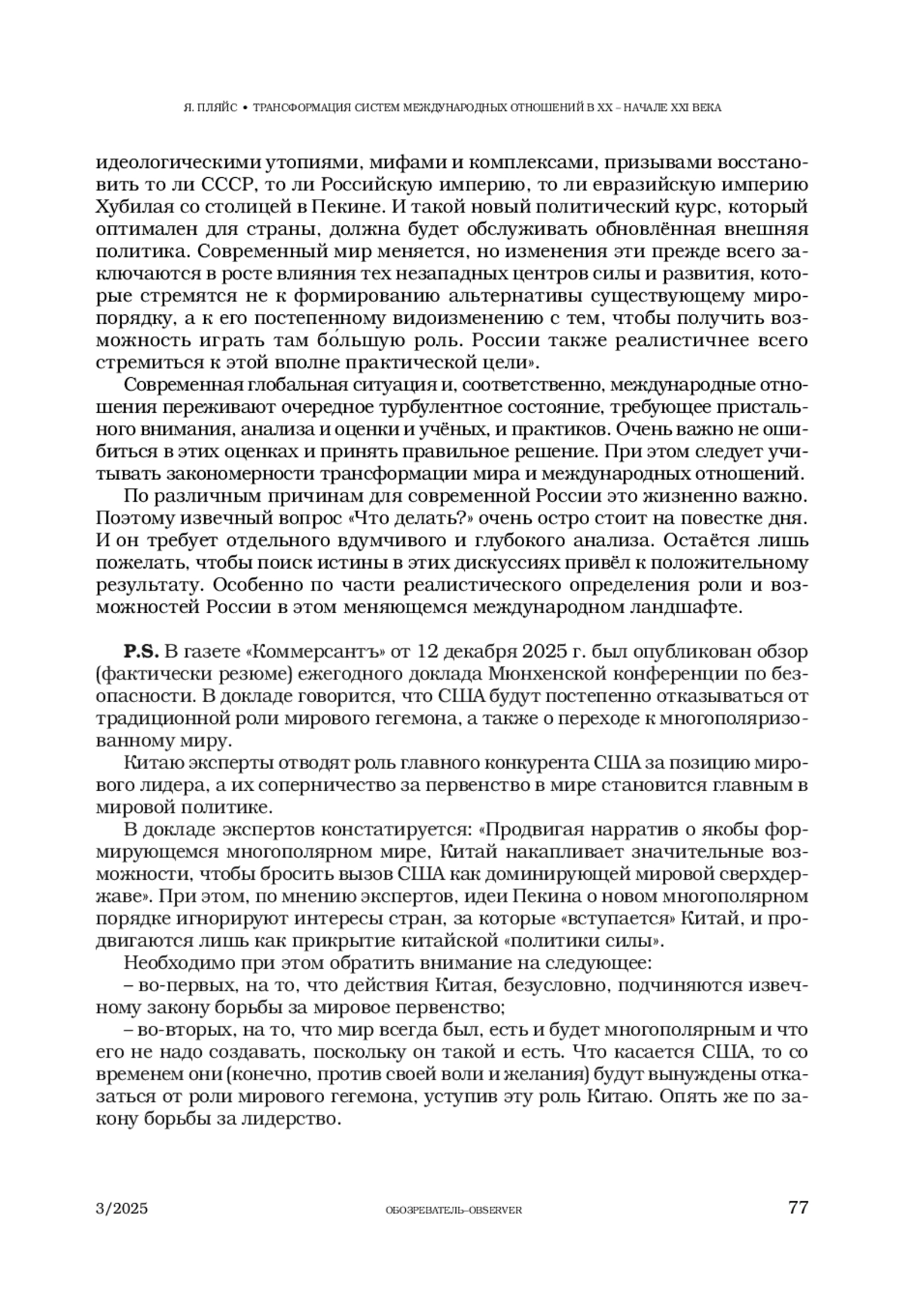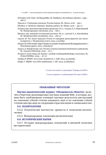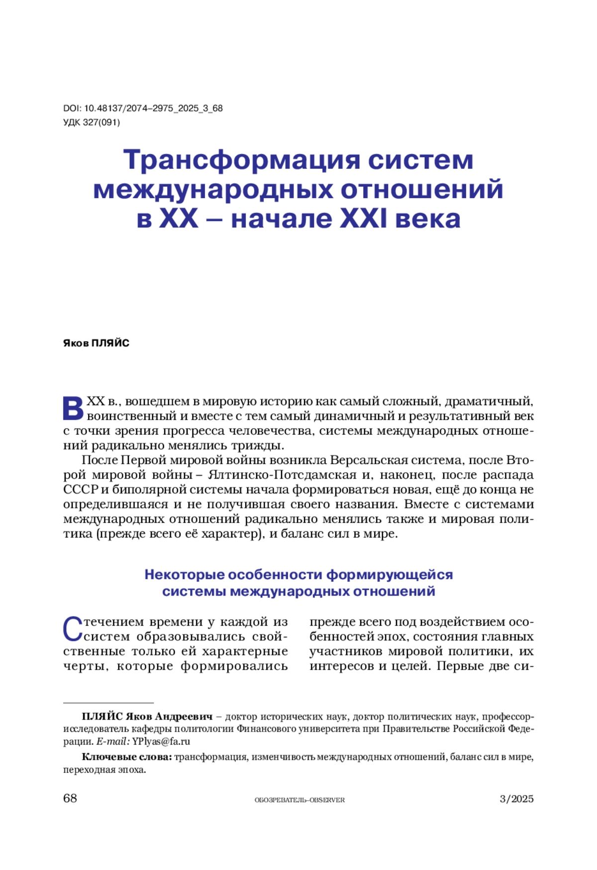 ПЛЯЙС Я. А. ТРАНСФОРМАЦИЯ СИСТЕМ МЕЖДУНАРОДНЫХ ОТНОШЕНИЙ В XX – НАЧАЛЕ XXI ВЕКА // ОБОЗРЕВАТЕЛЬ. 2025. № 3