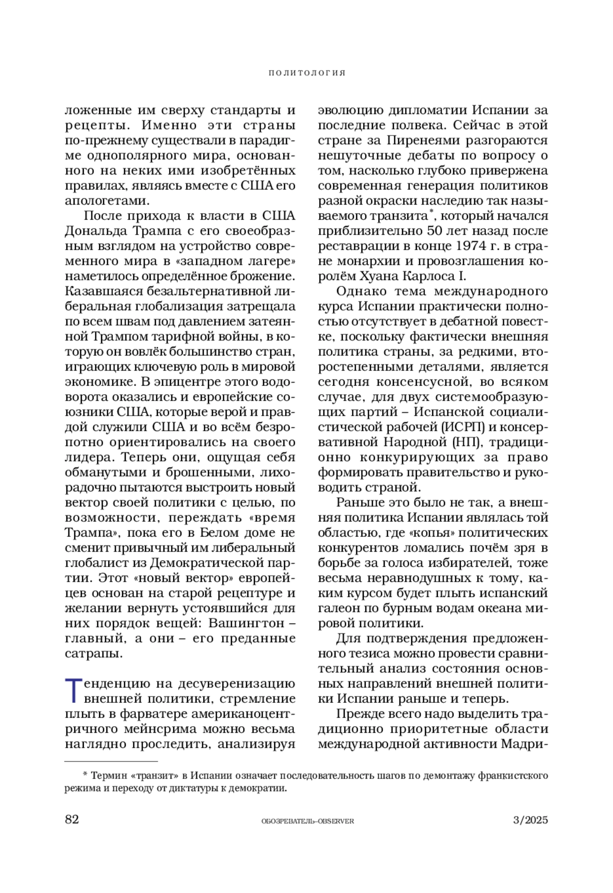 В последние десятилетия Испания, стремясь плыть в фарватере западного, американоцентричного мейнстрима, утратила значительную часть своей внешнеполитической идентичности. Мадрид долгие годы существовал в парадигме однополярного мира, основанного на неких правилах, отвергая концепцию многополярности, на которую ориентируется всё больше государств мира. Это привело к тому, что Испания, в отличие от прежних лет, не имеет собственной позиции по ключевым вопросам мировой политики.