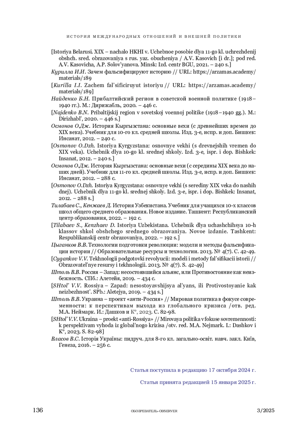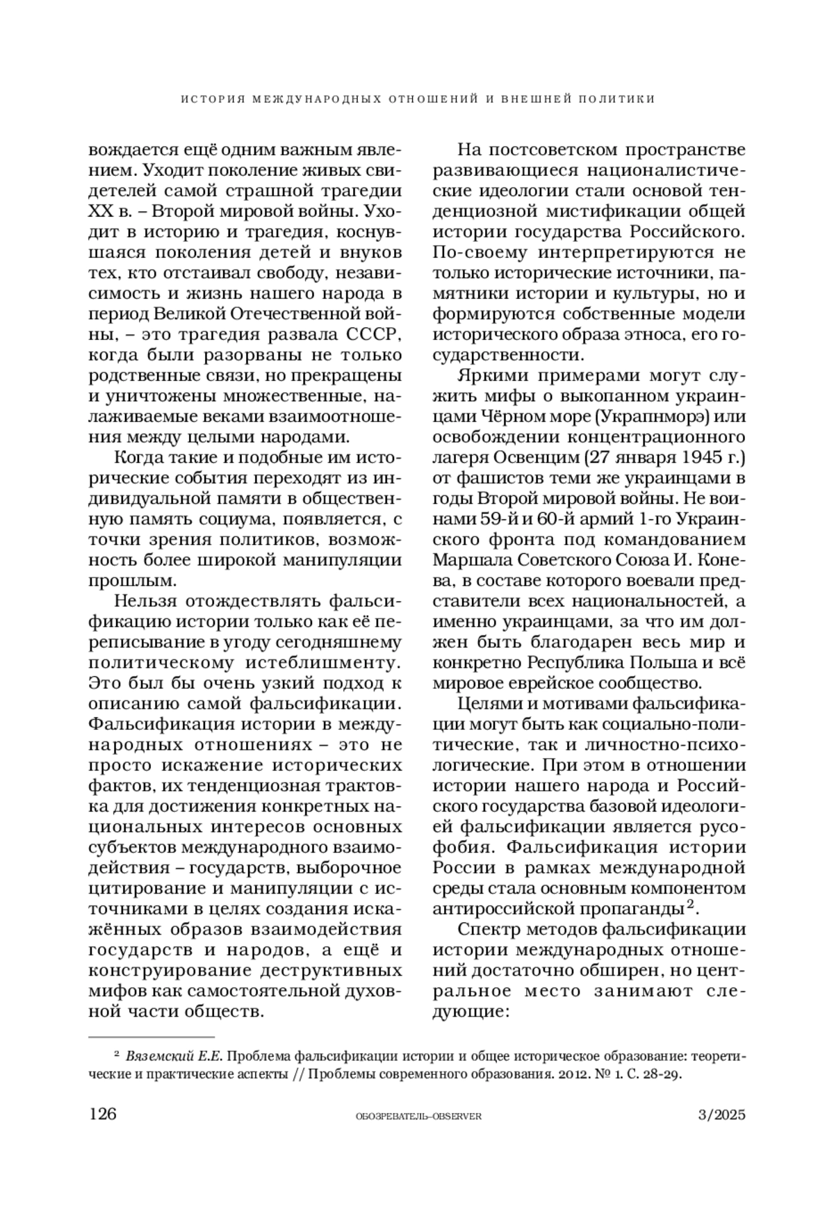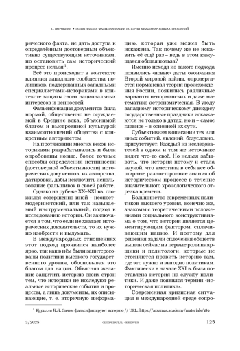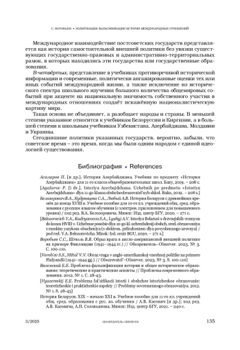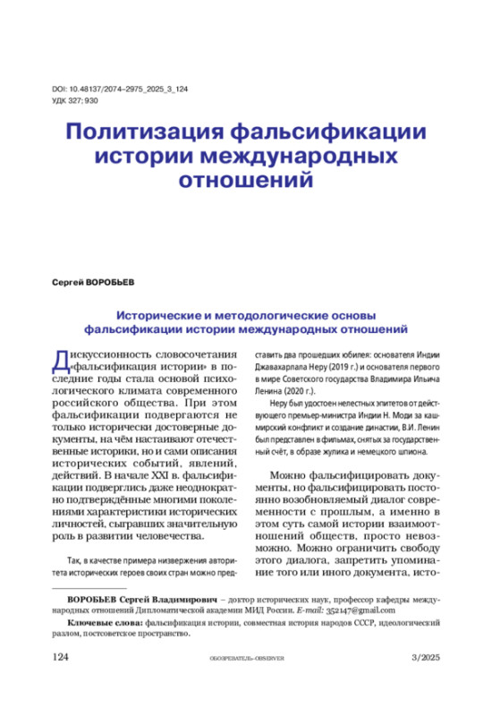 ВОРОБЬЕВ С. В. ПОЛИТИЗАЦИЯ ФАЛЬСИФИКАЦИИ ИСТОРИИ МЕЖДУНАРОДНЫХ ОТНОШЕНИЙ // ОБОЗРЕВАТЕЛЬ. 2025. № 3