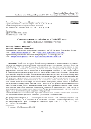 3. Мотревич, В. П. Совхозы Архангельской области в годы Великой Отечественной войны (по данным сводных годовых отчетов) / В. П. Мотревич // Вестник Северного (Арктического) федерального университета. Серия: Гуманитарные и социальные науки. - 2020. - № 5. - С. 26-36. DOI: 10.37482/2227-6564-V046 EDN: KSTUXC