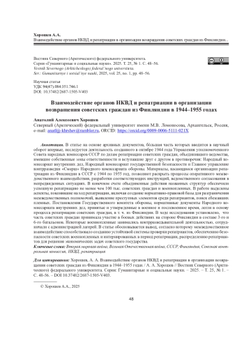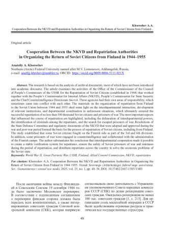 В статье на основе архивных документов, бóльшая часть которых вводится в научный оборот впервые, исследуется деятельность созданного в октябре 1944 года Управления уполномоченного Совета народных комиссаров СССР по делам репатриации советских граждан, объединившего ведомства, имевшие собственные зоны ответственности и вступавшие друг с другом в противоречия: Народный комиссариат внутренних дел, Народный комиссариат государственной безопасности и Главное управление контрразведки «Смерш» Народного комиссариата обороны. Материалы, касающиеся организации репатриации из Финляндии в СССР с 1944 по 1955 год, позволяют раскрыть процессы оперативного межведомственного взаимодействия, разработки соответствующих инструкций, ведомственного согласования в непредвиденных ситуациях. В конечном счете объединенные действия названных структур обеспечили успешную репатриацию не менее чем 100 тыс. советских граждан и военнопленных. В работе выделены аспекты, повлиявшие на ход репатриации, включая создание нормативно-правовой базы для разграничения межведомственных полномочий, выявление преступных элементов среди репатриантов, поиск сбежавших пленных. Постановления Государственного комитета обороны, нормативные документы Народного комиссариата внутренних дел, принятые и утвержденные в военное и послевоенное время, легли в основу процесса репатриации советских граждан, в т. ч. из Финляндии. В ходе исследования установлено, что часть советских граждан принимала участие в боевых действиях на стороне Финляндии в составе 3-го и 6-го батальонов. Некоторые военнопленные занимались контрразведывательной деятельностью, сотрудничали с администрацией лагерей. В статье обосновывается вывод, согласно которому межведомственное взаимодействие способствовало созданию устойчивой системы проверки репатриантов, обеспечению безопасности советских военнопленных и интернированных в период репатриации, распределению репатриантов для решения экономических задач советского государства.