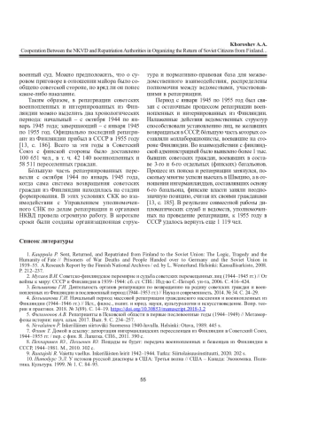 1. Kauppala P. Sent, Returned, and Repatriated from Finland to the Soviet Union: The Logic, Tragedy and the Humanity of Fate // Prisoners of War Deaths and People Handed over to Germany and the Soviet Union in 1939-55. A Research Report by the Finnish National Archives / ed. by L. Westerlund. Helsinki: Kansallisarkisto, 2008. P. 212-237.