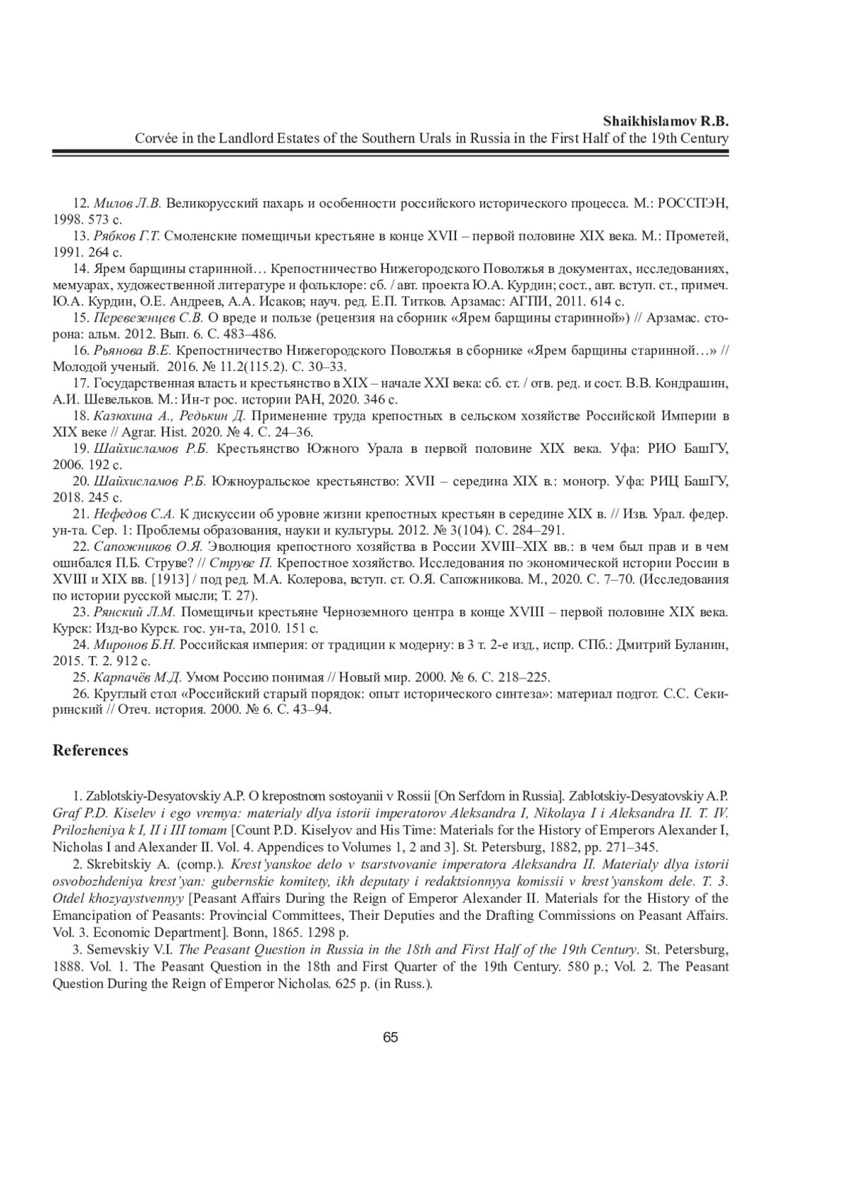 19. Шайхисламов Р.Б. Крестьянство Южного Урала в первой половине XIX века. Уфа: РИО БашГУ, 2006. 192 с. EDN: QPEJNH