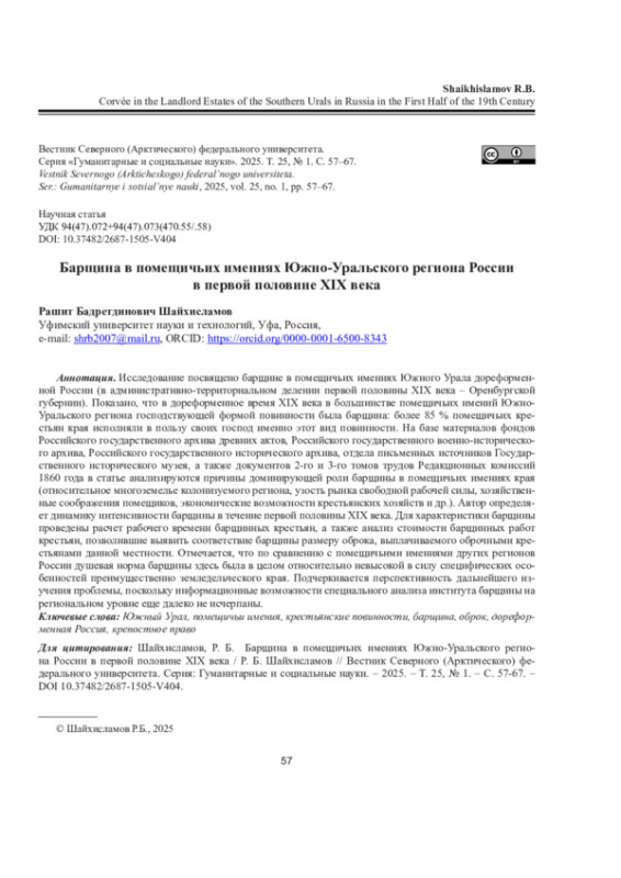 Исследование посвящено барщине в помещичьих имениях Южного Урала дореформенной России (в административно-территориальном делении первой половины XIX века - Оренбургской губернии). Показано, что в дореформенное время XIX века в большинстве помещичьих имений ЮжноУральского региона господствующей формой повинности была барщина: более 85 % помещичьих крестьян края исполняли в пользу своих господ именно этот вид повинности. На базе материалов фондов Российского государственного архива древних актов, Российского государственного военно-исторического архива, Российского государственного исторического архива, отдела письменных источников Государственного исторического музея, а также документов 2-го и 3-го томов трудов Редакционных комиссий 1860 года в статье анализируются причины доминирующей роли барщины в помещичьих имениях края (относительное многоземелье колонизуемого региона, узость рынка свободной рабочей силы, хозяйственные соображения помещиков, экономические возможности крестьянских хозяйств и др.). Автор определяет динамику интенсивности барщины в течение первой половины XIX века. Для характеристики барщины проведены расчет рабочего времени барщинных крестьян, а также анализ стоимости барщинных работ крестьян, позволившие выявить соответствие барщины размеру оброка, выплачиваемого оброчными крестьянами данной местности. Отмечается, что по сравнению с помещичьими имениями других регионов России душевая норма барщины здесь была в целом относительно невысокой в силу специфических особенностей преимущественно земледельческого края. Подчеркивается перспективность дальнейшего изучения проблемы, поскольку информационные возможности специального анализа института барщины на региональном уровне еще далеко не исчерпаны.
